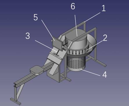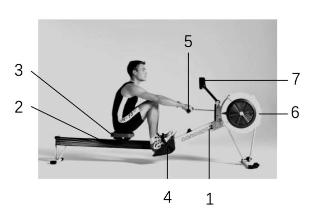 An air rower consists of 7 parts as shown in Figure 1. The frame, labeled as number 1, is the foundation of the rower, which is made of aluminum or steel frame and provides stability and support. It is the foundation frame for installing other parts. The track, labeled as number 2, is the track on which the user slides back and forth. It is made of aluminum or steel, with a smooth surface to reduce friction. The seat, labeled as number 3, is the position where the user sits. It is