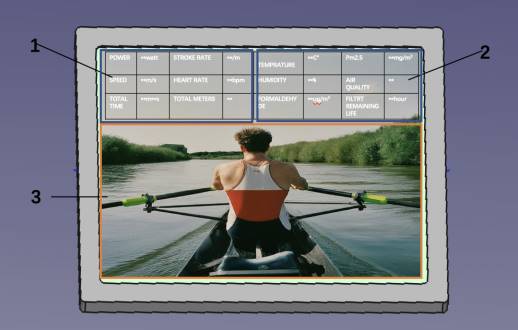 The performance monitor, labeled as number 5, besides being able to monitor the performance of fitness such as power, speed, time, distance, stroke rate, etc., should also display whether the air purification module is working normally, whether the air quality is good, temperature, humidity and PM2.5 value, etc., the condition and remaining life of the filter, reminding the user to replace the filter, and other interesting and entertaining content and design [7]. The interface of the performance monitor is shown in Figure 6. The display area labeled as number 1 gives the information of the performance of fitness, the display area labeled as number 2 gives the information of air condition, and the display area labeled as number 3 gives the information of interesting and entertaining content.