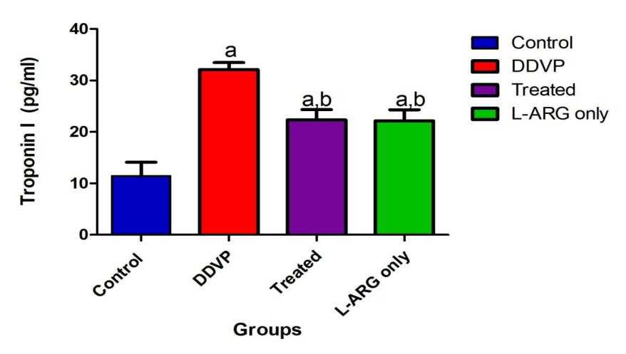 Figure 1. Impact of L-arginine on Troponin I of dichlorvos-exposed and L-arginine supplemented rats.