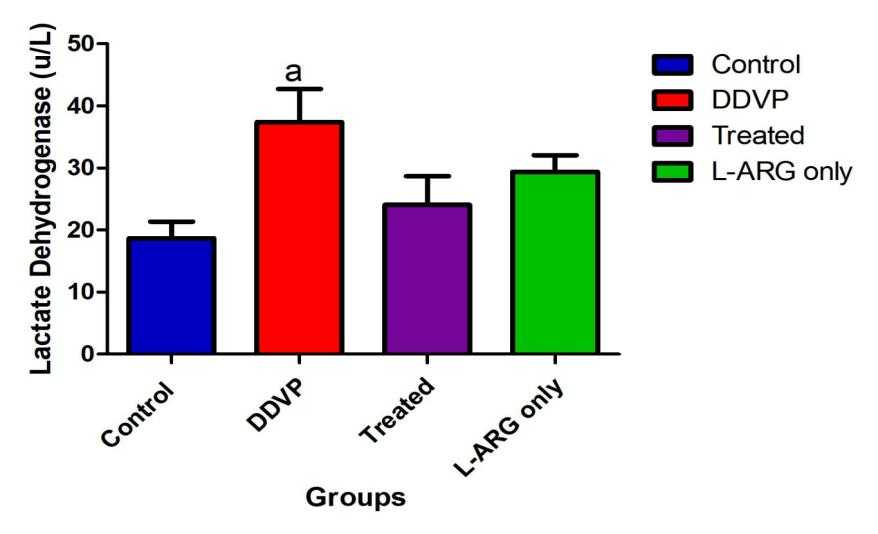 Figure 2. Impact of L-arginine on lactate dehydrogenase of dichlorvos-exposed and L-arginine supplemented rats.