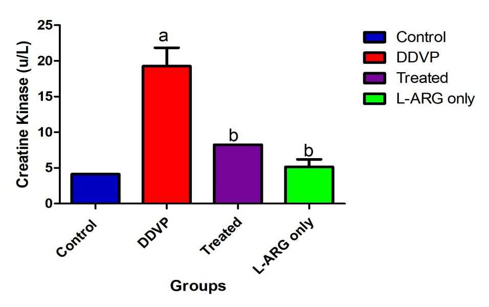 Figure 3. Impact of L-arginine on creatinine kinase of dichlorvos-exposed and L-arginine supplemented rats.