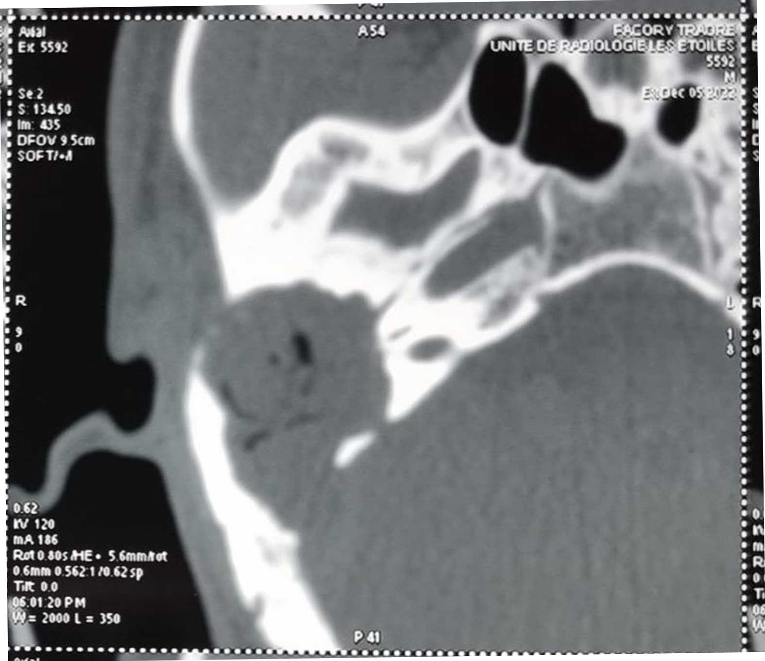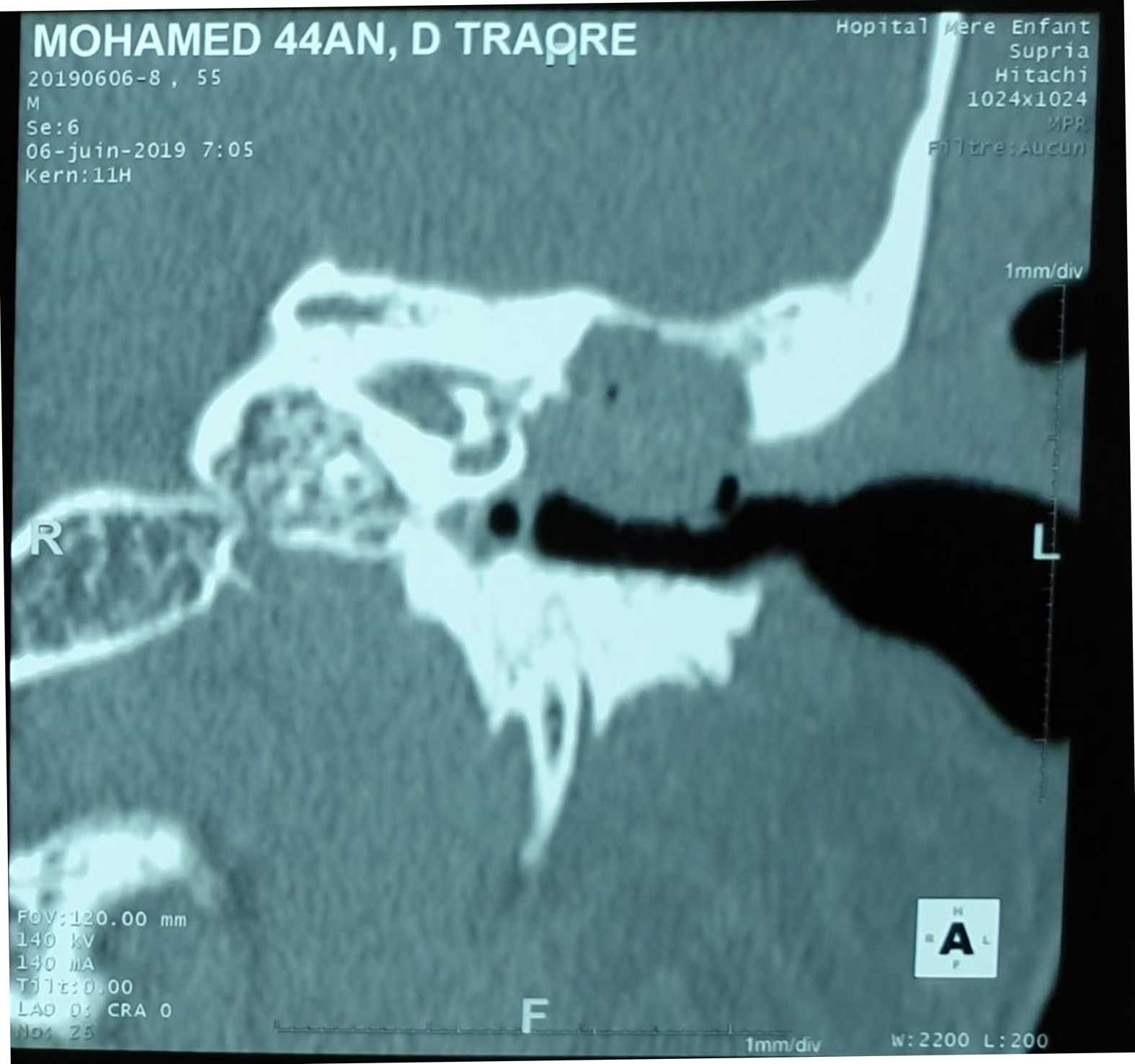 Sociodemographic data: age, sex, ATCDS, clinical data: reason for consultation, consultation time, affected ear, otoendoscopic examinations, pure-tone audiometry with hearing loss on frequencies 500, 1000, 2000, 4000, and Rinne average audiometric, CT rocks, therapeutic data: TTF, TTO, postoperative clinical and paraclinical monitoring, the average follow-up time was 6 months.