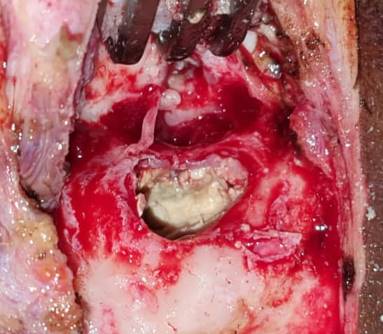 Figure 3. Intraoperative view of the left ear with visualizing a whitish mass in the mastoid cavity in favor of the cholesteatoma.