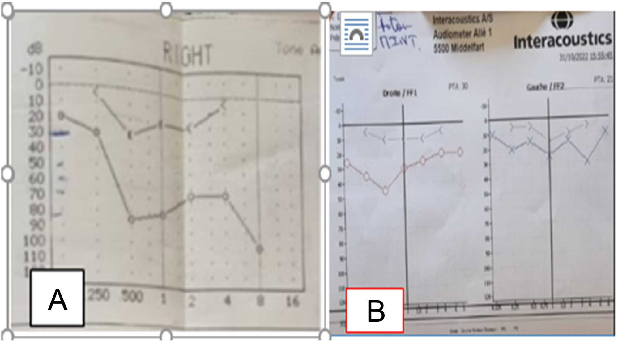 Figure 4. (A) Audiogram showing conductive hearing loss with an average PAM of 78.75 db with an audiometric signal average at 55 dB; (B) Control audiometry 9 months post-operative significant closure of the rinne going from 55 db to 21.25 and the PAM from 78.75 to 30 db.