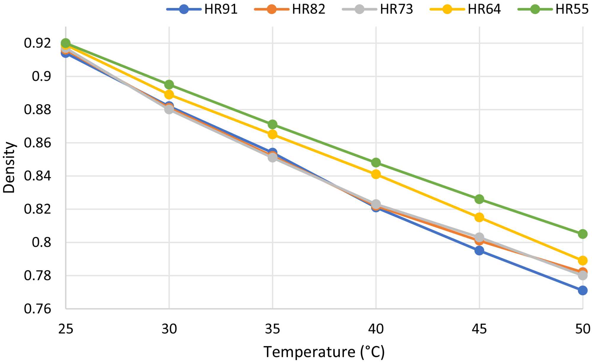 Specific gravity represents the mass of the unit volume at a given temperature. The density of the formulations was determined according to standard NF EN ISO 6883 [12] over a temperature range from 25˚C to 50˚C.
