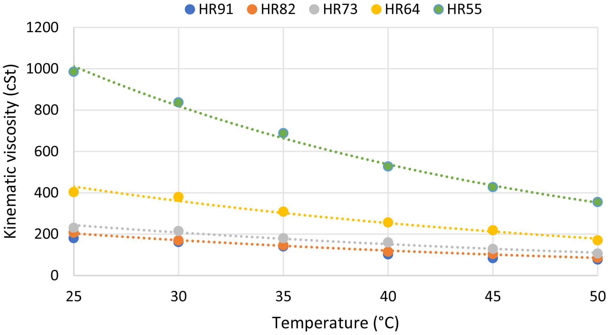 To determine and compare the intrinsic parameters of the different formulations, such as activation energy, the influence of temperature on the kinematic viscosity of the formulations was studied (Figure 2).