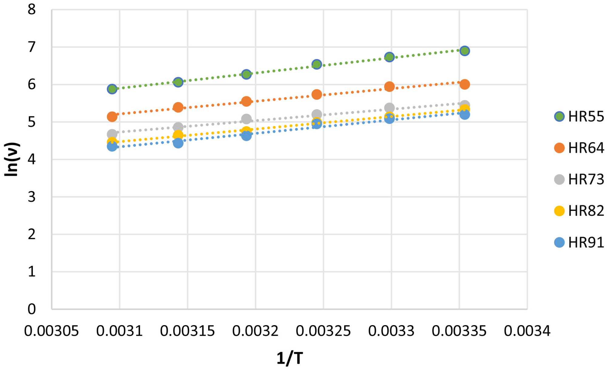The trends in the graphs in Figure 2 confirm that the kinematic viscosity of the HR55 formulation is the highest. The curves obtained are exponential. The kinematic viscosity of the formulations decreases as a function of temperature. This variation is described by Eyring’s formula according to Equation (6).