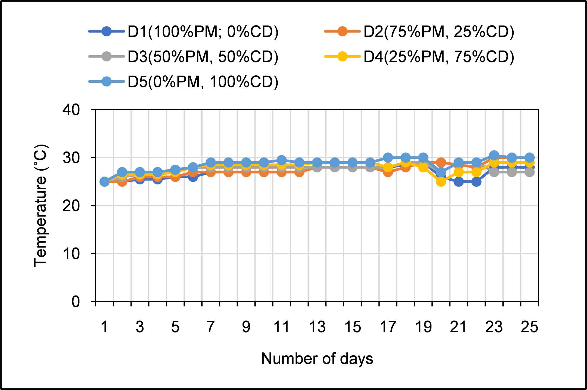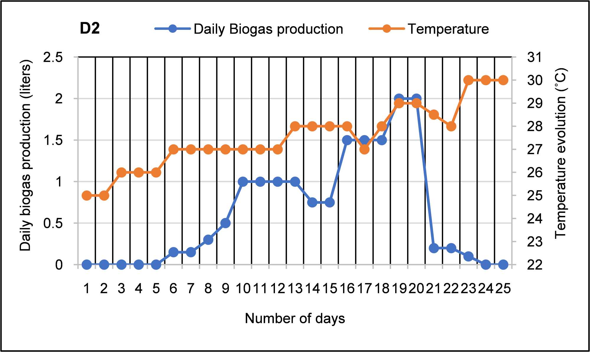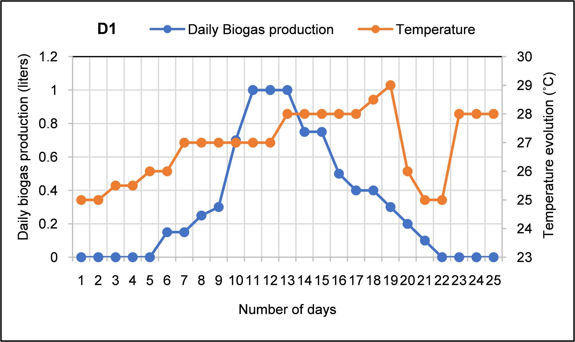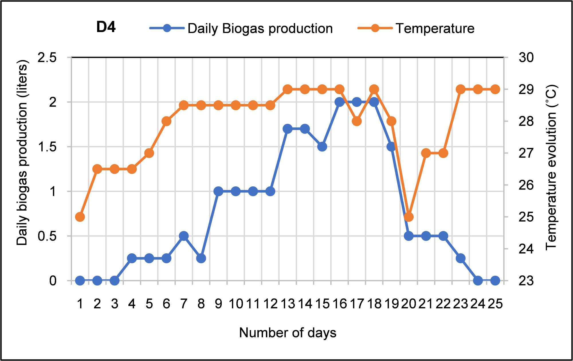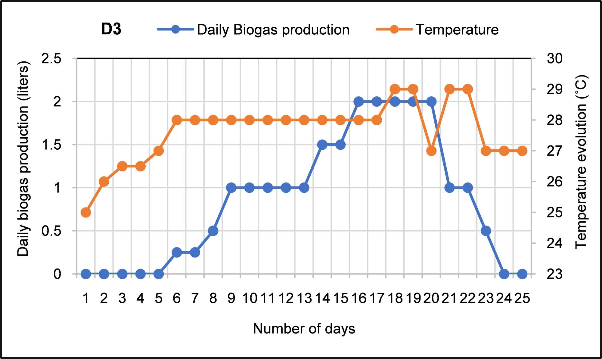 Examining the curves of daily biogas production and temperature evolution, for digester D1 we remarked from the start of biogas production (4th day) to 14th day an inverse relation between biogas production and temperature. In fact, each increase in biogas production over a day interval corresponds to a stabilization (plateau) of the temperature over the same interval (Figure 3(a)) while a stabilization (plateau) in biogas production over a day interval leads to an increase in temperature. From 15th day this trend is observed. For digester D3 a long period of temperature stabilization (plateau) is observed (from 6th to the 17th day) (Figure 3(c)) while biogas production increases and reaches its maximum value (Figure 3(c)). From Figure 3, it can be concluded the substrate in Digester D3 is the best mixture of pig manure and cow dung for optimal biogas production.