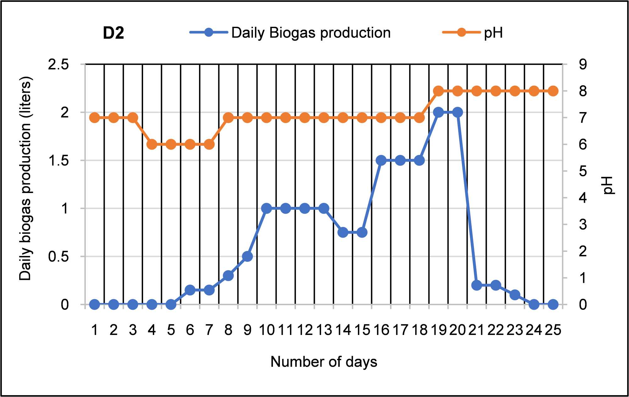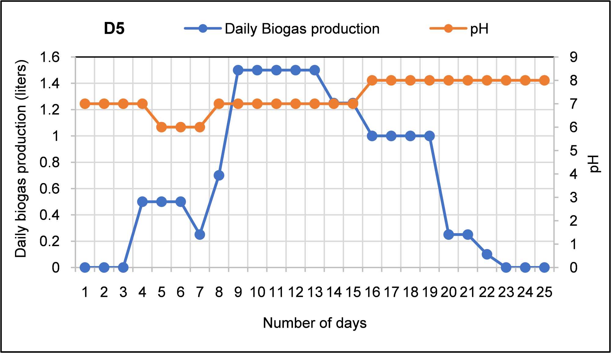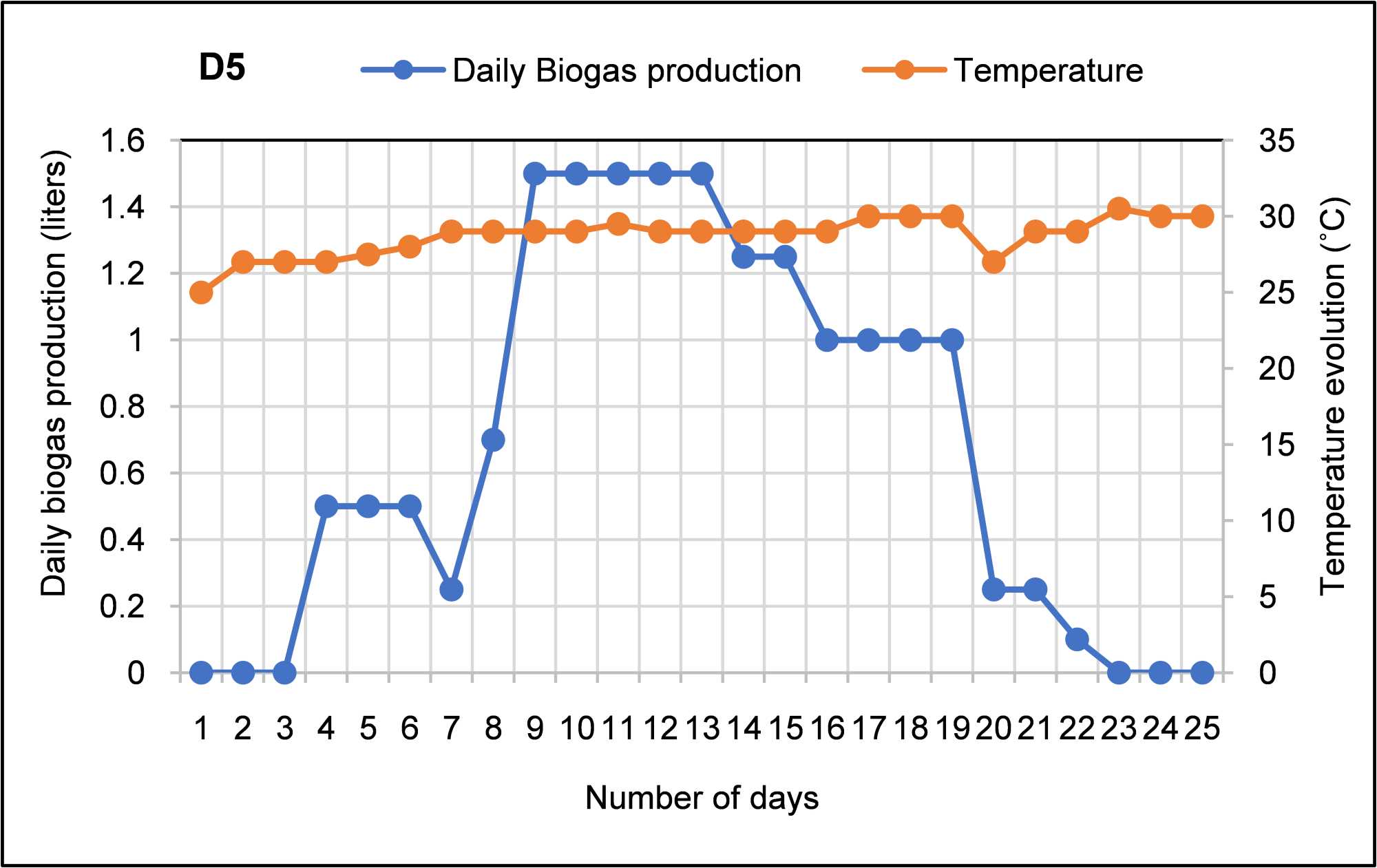 For daily biogas production (Figure 8(a)), it can be seen that during the 25 days of digestion, the largest quantity of biogas was recorded on the 15th day in the digesters (D3 and D4) with a value of 2 liters. The same value was recorded on the 19th day in digester D2. The second largest value of biogas produced is 1.5 liters, recorded on the 8th day in digester D5 and the smallest value 1liter was recorded on the 11th day in digester D1. For daily temperature evolution (Figure 8(b)), the temperature in the digesters D1, D3 and D4 varied from 25˚C to 29˚C. It varied from 25˚C to 30˚C in digesters D2 and D5. For daily pH evolution (Figure 8(c)), the pH variation curves of the substrates show that, during the digestion process, the pH varied from 5 to 8 in the five (5) digesters. For daily pressure evolution, it is observed the pressure curves in the five digesters are the same trends and during the digestion process, the pressure varied in the five (5) digesters with different average values.
