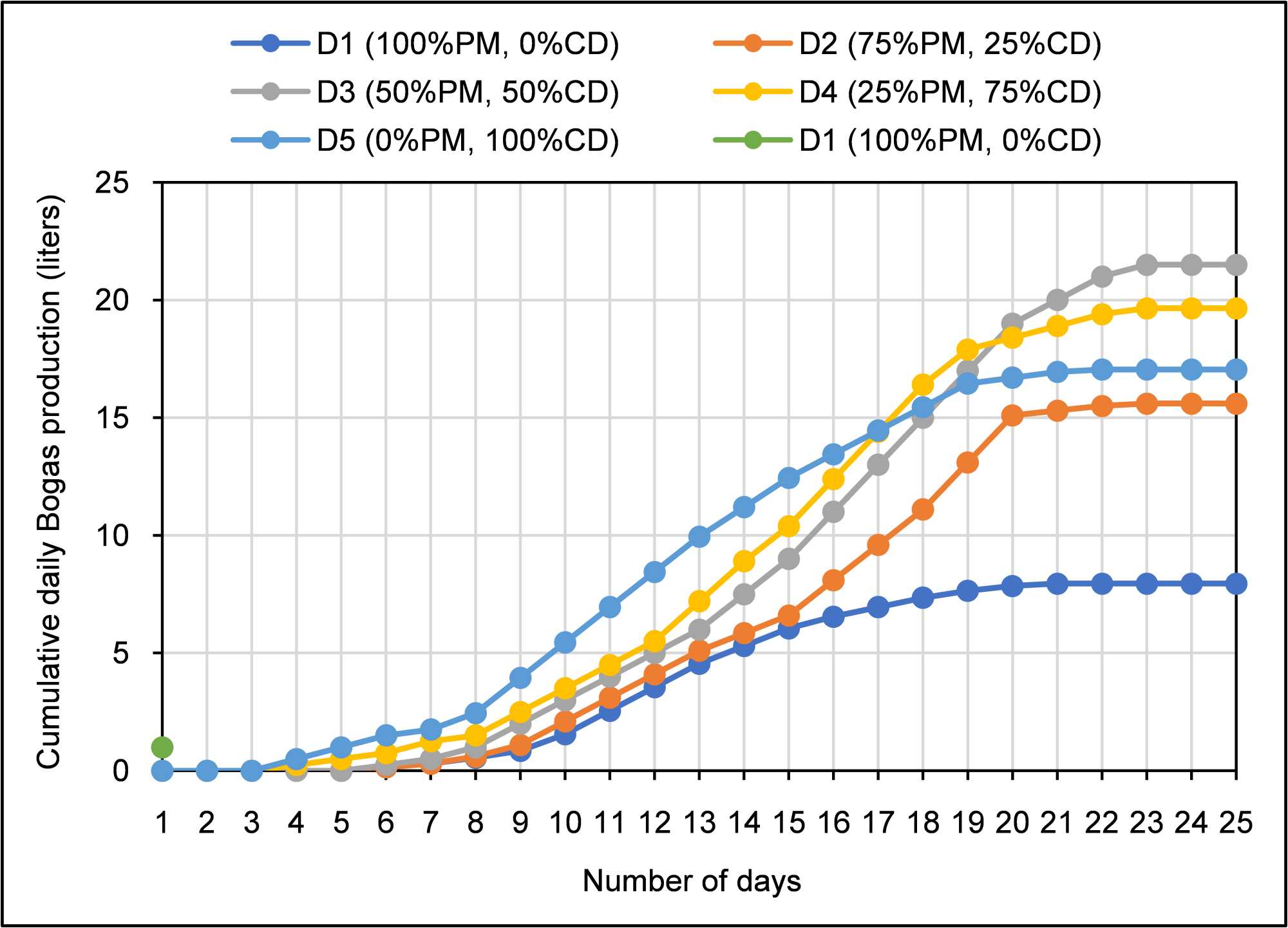 The diagrams in Figure 6 show the cumulative biogas production during the 25 days of digestion for the substrates of the five digesters.