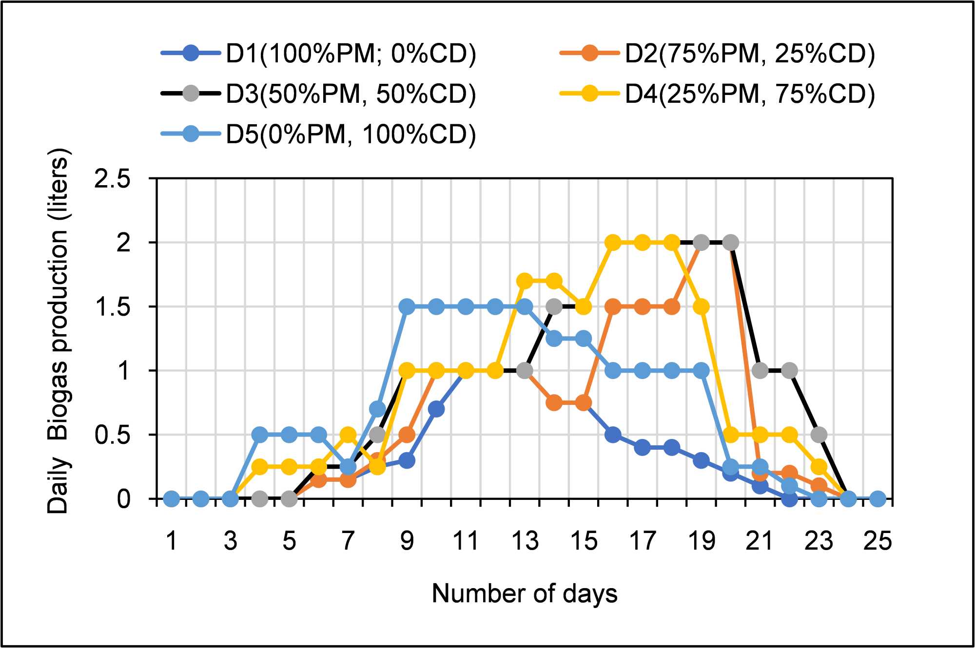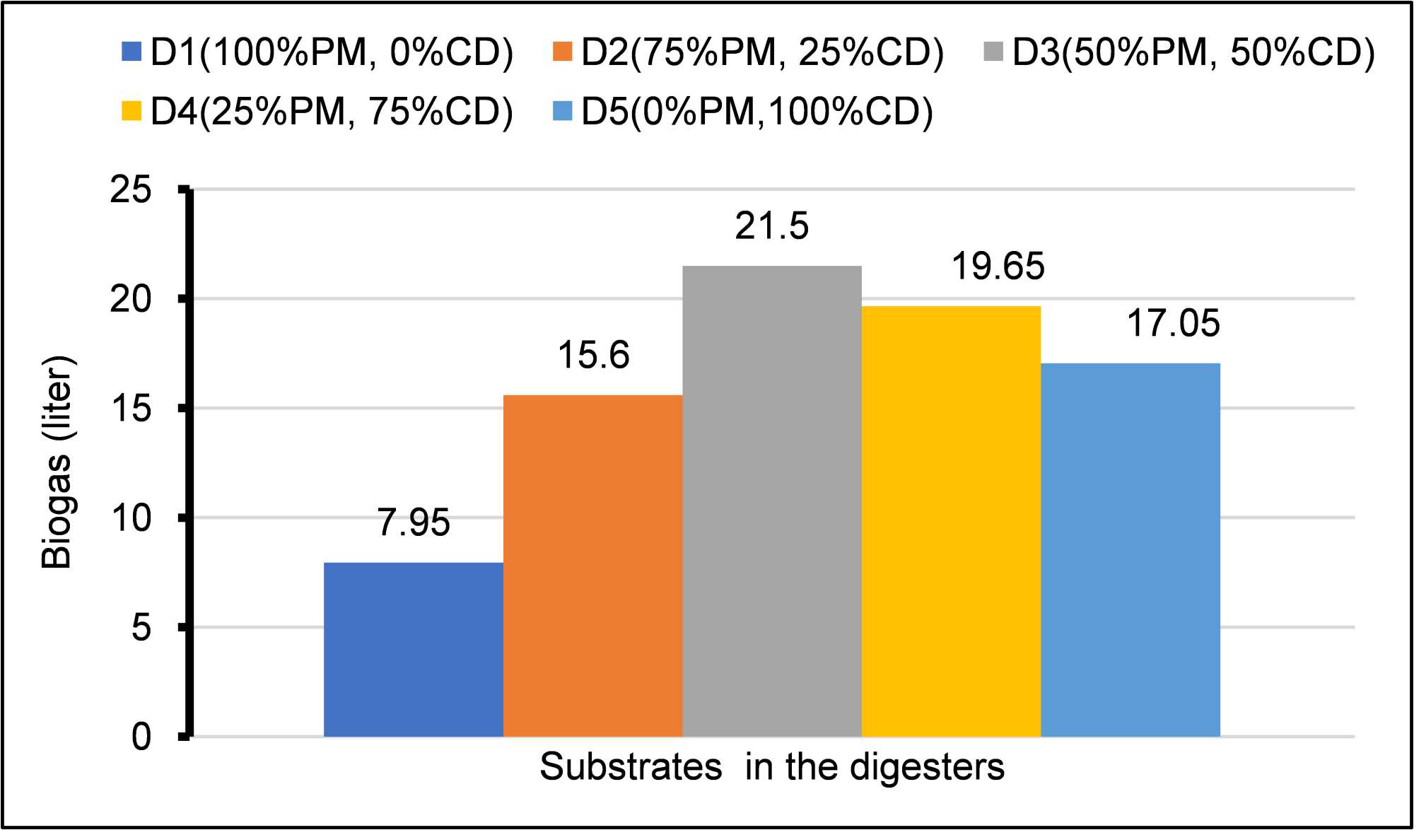 The cumulative production of biogas from pig manure and cow dung substrates in the proportions indicated in Table 1 are: D1 (7.95 liters), D2 (15.60 liters), D3 (21.50 liters), D4 (19.65 liters) and D5 (17.05 liters) (Figure 6). The cumulative production total is 81.75 liters. It appears from these results that the substrate of digester D3 (50% Pig manure and 50% Cow dung) has the highest cumulative value of biogas products (21.5 liters) following by D4 (25% Pig manure and 75% Cow dung), 19.65 liters showing thus the co-digestion substrates remain the most favorable in anaerobic digestion for optimal biogas production [26] [27].