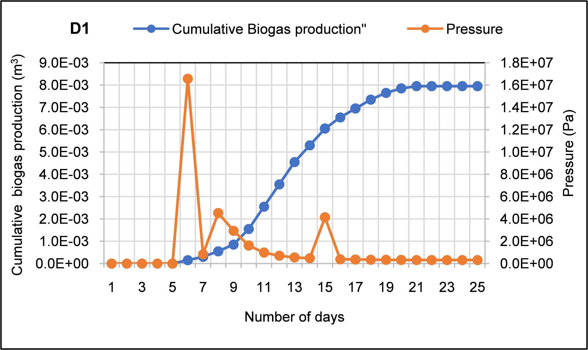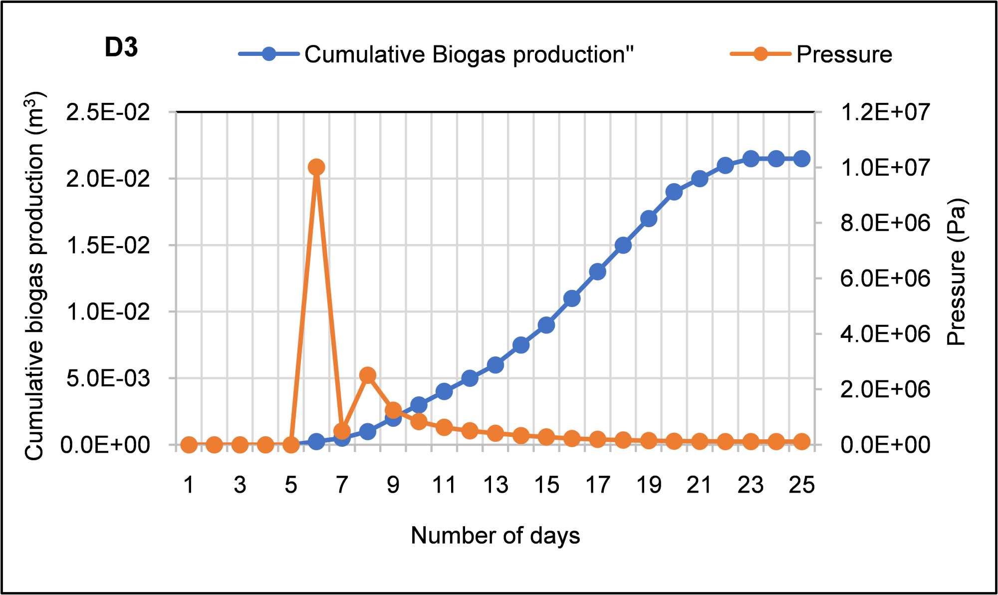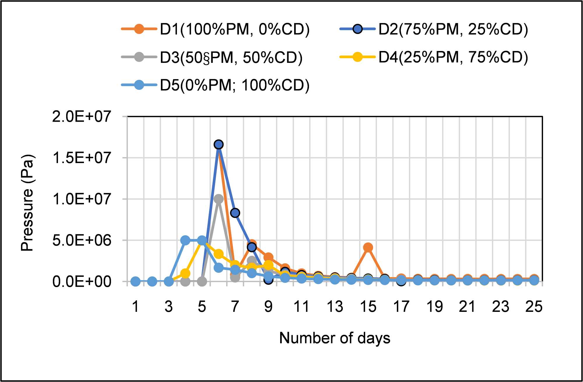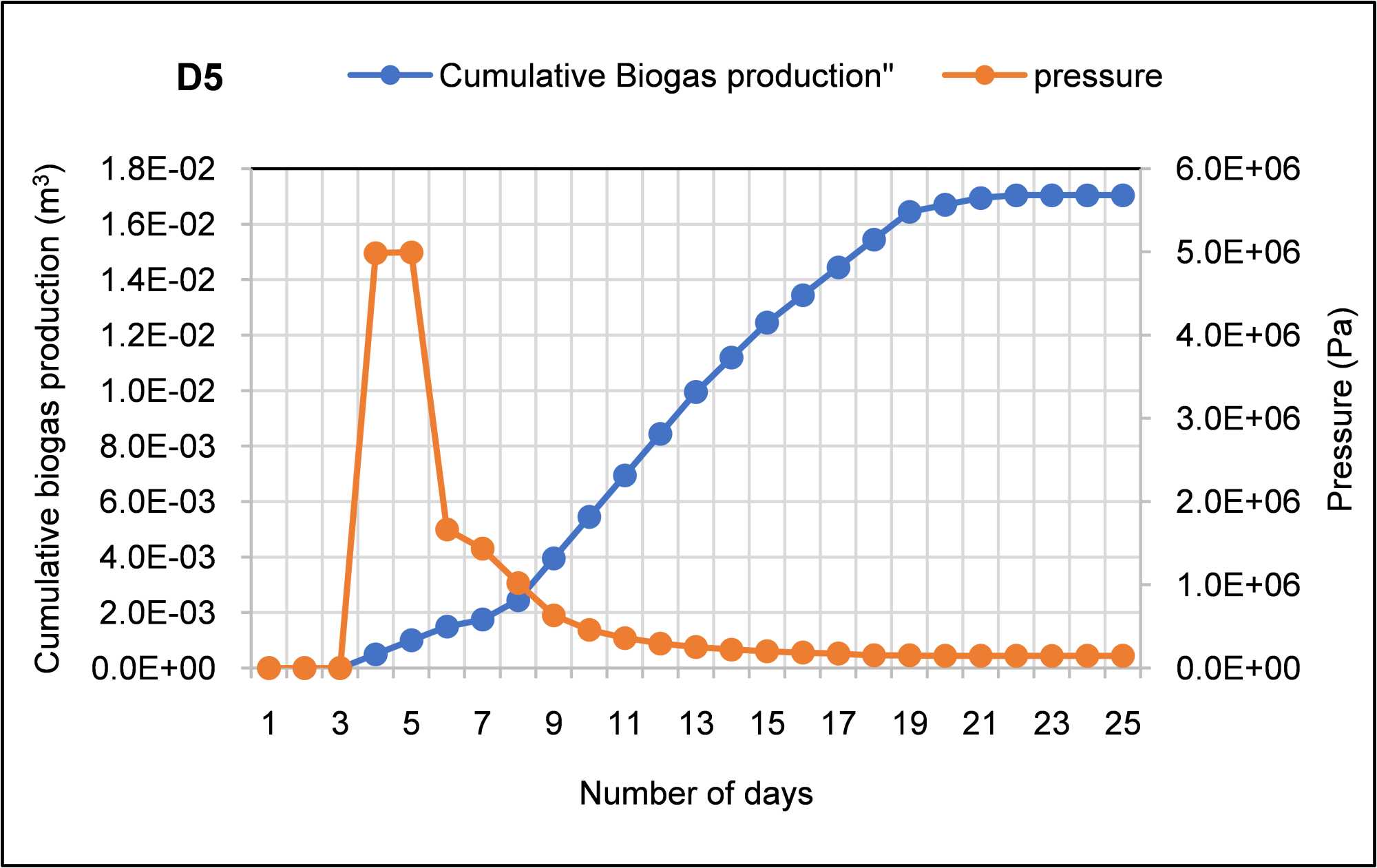 We observed three phases for the pressure curves (Figures 7(a)-(e)). Phase 1: A rapid increase of pressure followed by rapid decrease (5th day to 7th day) for digester D1 and D3 (Figures 7(a)-(c)), (5th day to 9th day) for digester D2 (Figure 7(b)), (3th day to 8th day) for digester D4 (Figure 7(d)) and (3th day to 6th day) for digester D5 (Figure 7(e)); Phase 2: a small increase of pressure (7th day to 8th day) for digester D1 and D3 (Figures 7(a)-(c)), (9th day to 10th day) for digester D2 (Figure 7(b)), (8th day to 9th day) for digester D4 (Figure 7(d)). This phase do not exist for digester D5; Phase 3: A decrease of pressure (10th day to 25th day) for digester D2, (8th day to 25th day) for digester D3, (9th day to 25th day) for digester D4, (6th day to 25th day) for digester D5, and (8th day to 14th day) for digester D1.