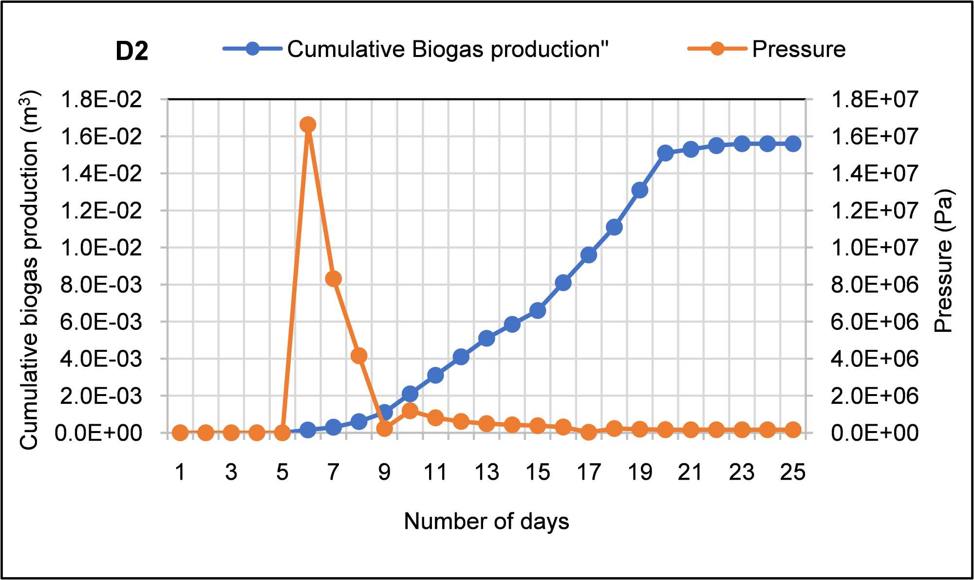 After following the evolution of biomethanization parameters of substrates (temperature, pH), we presented in this subsection the cumulative biogas production and the evolution of the pressure generated by their production. This is illustrated in Figure 7 for biogas from the five digesters. It is observed that the pressure curves from the five digesters are the same trends. During the digestion process, the pressure of cumulative biogas varied in the five (5) digesters with different average values. 3.15*105 Pascal for the substrate of digester D1 (Figure 7(a)); 1.61*105 Pascal for digester D2 (Figure 7(b)); 1.16*105 pascal for digester D3 (Figure 7(c)); 1.28*105 pascal for digester D4 (Figure 7(d)) and 1.48*105 pascal for digester D5 (Figure 7(e)).