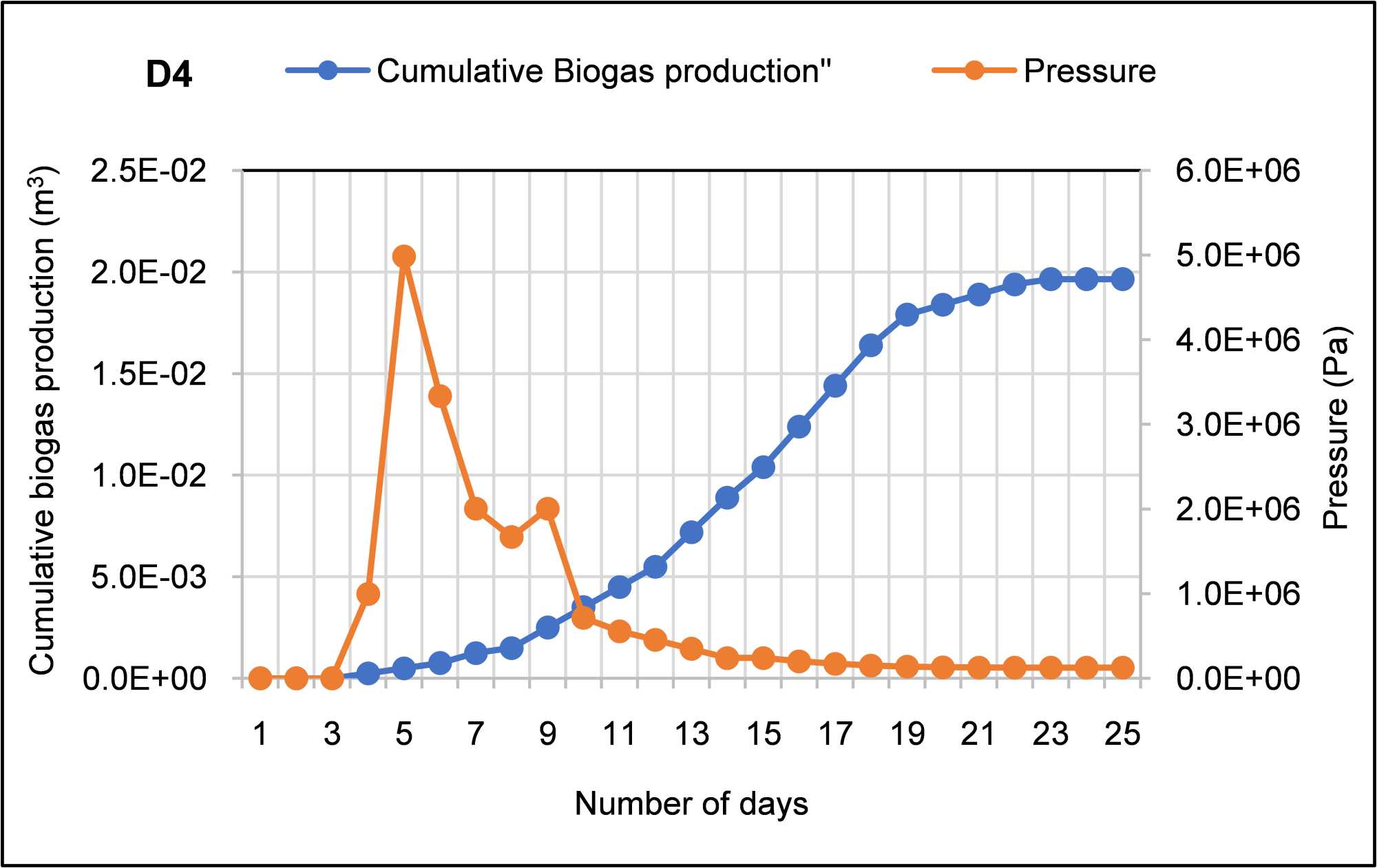 For a constant volume of the gasometer, increased pressure was a result of increased volume of biogas generated. The pressure can therefore be calculated by the relation between the pressure and the volume of an ideal gas.
