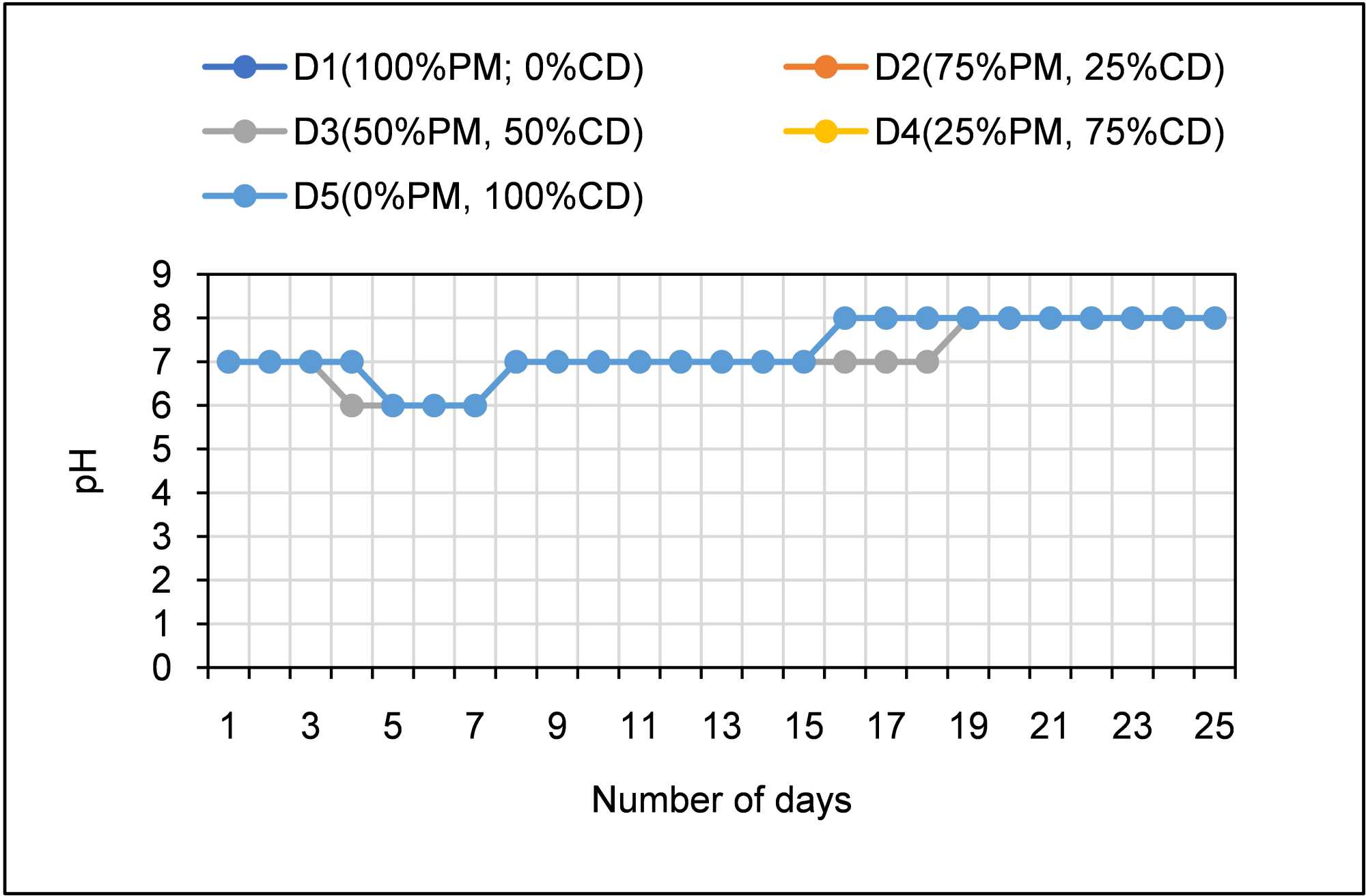 During the 25 digestion days, three phases of pH evolution were observed for each type of substrate: an acidic phase (pH around 6) until the 7th day for all the digesters (Figures 4(a)-(e)); a neutral phase (pH around 7) from the 8th to the 18th day for digesters D1, D2 and D3 (Figures 4(a)-(c)) and from 8th to 15th for digesters D4 and D5 (Figure 4(d), Figure 4(e)); une phase basique (pH autour de 8) du 18eme au 25eme jour pour les digesteurs D1, D2 et D3 (Figures 4(a)-(c)) et 15eme au 25eme pour les digesteurs D4 et D5 (Figure 4(d), Figure 4(e)). A basic phase (pH around 8) from the 18th to the 25th day for digesters D1, D2 and D3 (Figures 4(a)-(c)) and from 15th to 25th for digesters D4 and D5 (Figure 4(d), Figure 4(e)). It should be remembered the variation in pH is one of the indices for appreciation of biogas production in an anaerobic medium. The pH value for optimal biomethanization is around neutral (6.8 - 7.5) [2]. This demonstrates the pH values recorded during this study remain favorable to biomethanization bacteria.