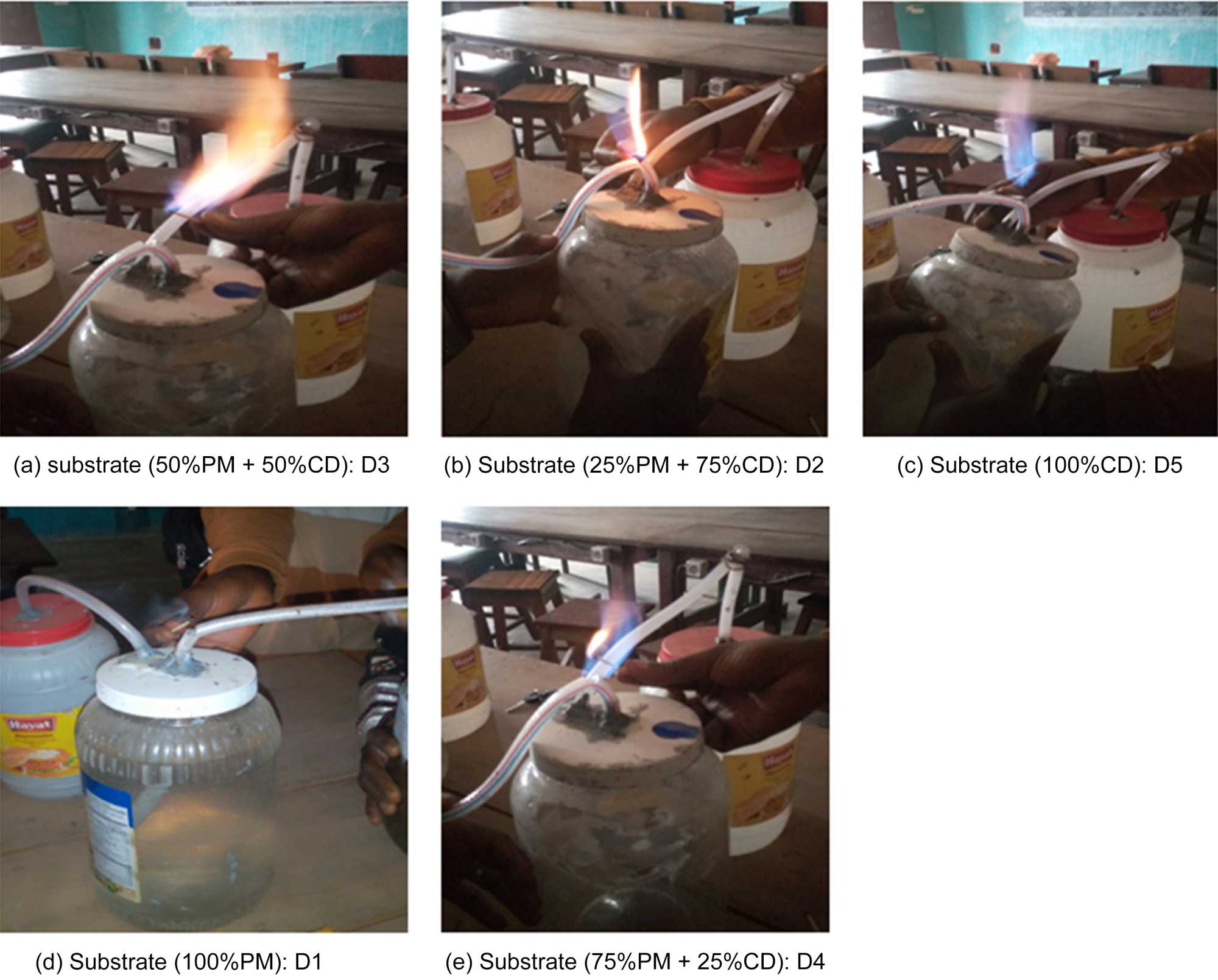 Biogas is a mixture combustible gas if the methane content is greater than or equal to 50%. The combustion of biogas is characterized by the release of a yellow or blue flame depending on the methane content. A persistent blue flame confirms the presence of methane in significant proportion (50%) or more [28]. The results obtained during this experimental study show that the biogas produced from the different types of substrates is combustible (Figure 9). The combustibility test revealed that the biogas produced by the substrates during the first two weeks was non-flammable. It was from the 15th day that the combustibility of the biogas produced began, and it is from the 20th day that a significant quantity of methane with a stable flame was observed. It appears from this test, the quantities of biogas produced by the substrates (50%PM + 50%CD, 25%PM + 75%CD and 0%PM + 100%CD) respectively in the digesters (D3, D4 and D5) were very combustibles (Figures 9(a)-(c)). These test results confirm the importance of co-digestion of pig manure with cow dung in different proportions for combustible biogas production [29].