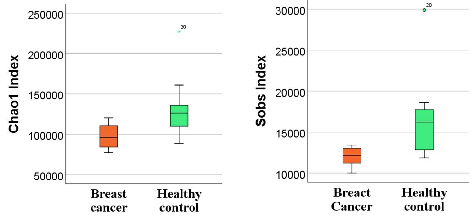 In this study, alpha diversity analysis revealed a significant difference in the Sobs and Chao1 indices (p < 0.05). Women with breast cancer had lower alpha diversity than healthy women. This same finding has been reported by several authors in studies on similar populations in Ghana, the United States, and China [28]-[30]. Conversely, a study in China presented opposite results, where postmenopausal cases had a higher Sobs diversity index than postmenopausal controls, and the Shannon index was higher in premenopausal cases. However, in this study, microbiota characterization was performed using shotgun metagenomics, and the results presented were not adjusted for case-control groups [31]. The gut microbiota has often been mentioned in the regulation of estrogens, for example, in postmenopausal women, previous studies suggested a negative correlation between gut microbiota alpha diversity and estrogen concentrations in stool, while a positive correlation was observed in urine [32].