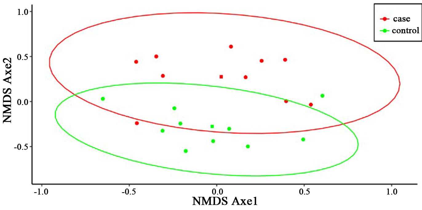 Non-metric multidimensional scaling (NMDS) analysis using the Bray-Curtis dissimilarity matrix revealed a difference in the distribution distance of the microbiota of cases compared to controls. The gut microbiota samples from the women were distributed in space, representing two distinct groups. One group consisted predominantly of cases samples, while the other group consisted predominantly of control samples (Figure 2). Additionally, molecular variance analysis (AMOVA) showed a significant difference between the two groups (p = 0.001).