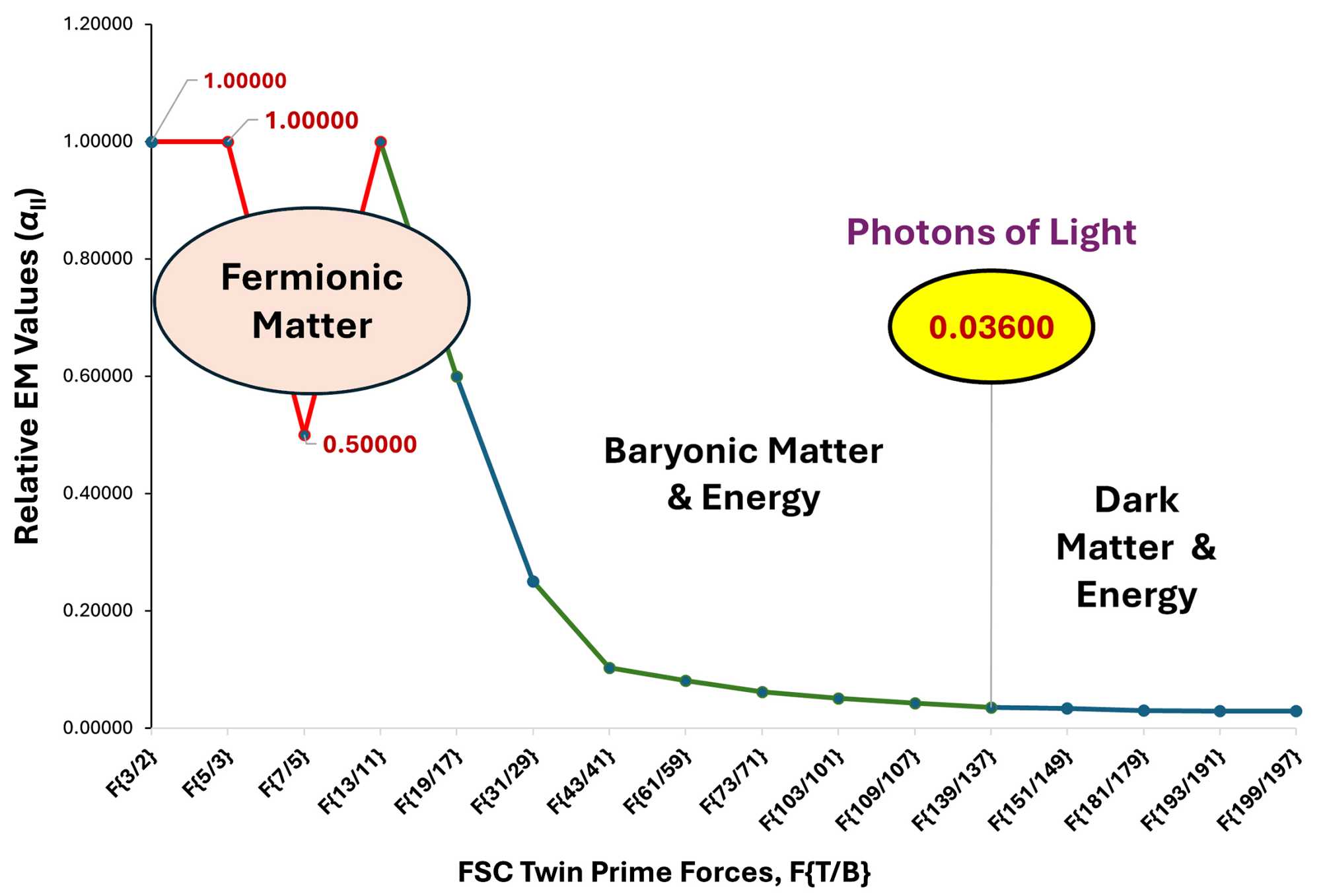 The eFSC Model began by calculating the property sets for the twin primes {139, 137}, where α = 139 over α = 137, and combining them to calculate the hybrid α = 137.036 [1], closely replicating the observed α value of 137.035999206 [4]. Applying these same calculations to other sets of twin primes from {3, 2}, {5, 3}, through {199, 197} produces a hierarchy of twin prime electromagnetic (EM) forces that comprise the eFSC Model [2] [3].