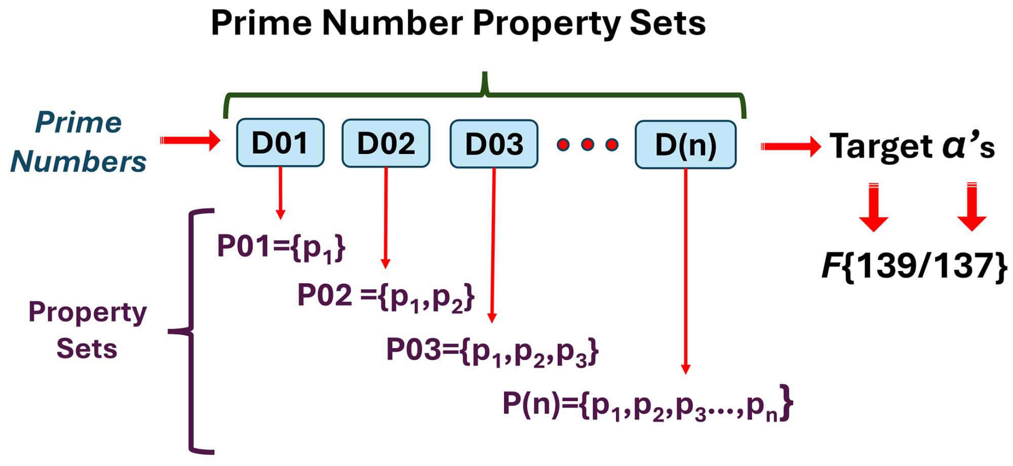 A Python algorithm was developed to calculate property sets for α = 137 and α = 139, where the sum of the elements, all prime numbers, equals their 137 or 139, respectively. The count of property sets (#139 & #137) was then used to calculate a hybrid value of F{139/137} where α = 137.036, using the expression: