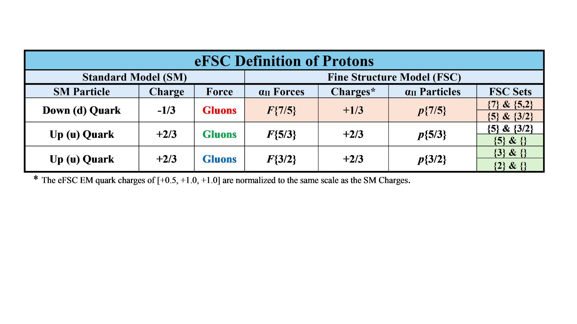The Standard Model describes a proton as having one down (d) quark with a charge of −1/3 and two up (u) quarks, each with a charge of +2/3, giving the proton a net charge of +1. Gluons mediate the strong nuclear force that binds the quarks together. In the eFSC Model, the corresponding quark-like particles are defined by the property labels p{7/5}, p{5/3}, and p{3/2}.