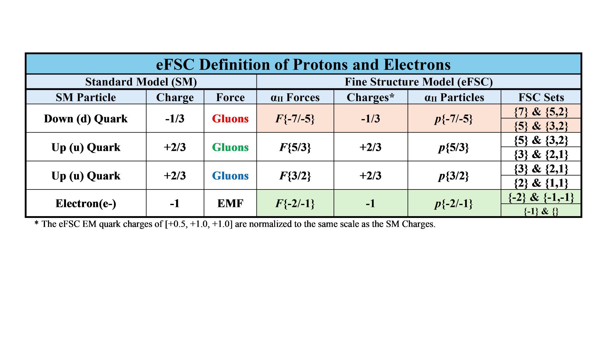 This table is divided into two sections: the Standard Model on the left and the eFSC Model on the right. The Standard Model describes the type of particles, in this case, down and up quarks, the charge of each quark, and the color-coded strong force (gluons) holding the quarks together.