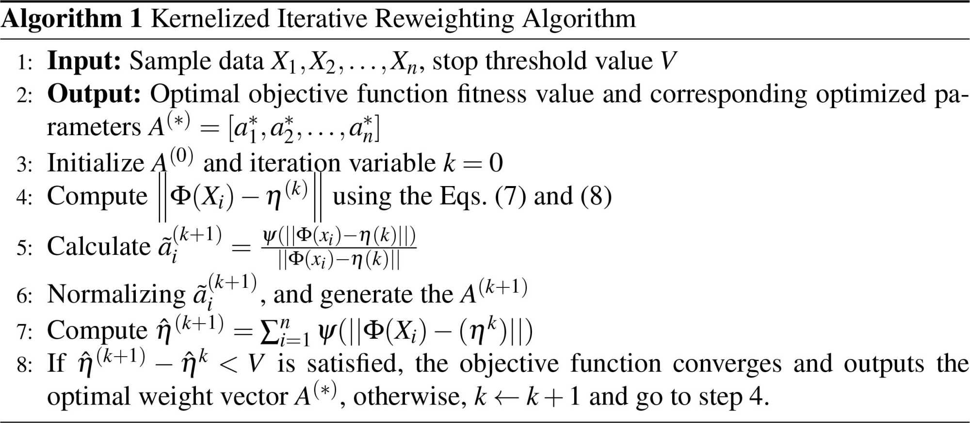 Algorithm 4.2 outlines the computational procedure for the kernelized iterative reweighting algorithm. During the update, the weights are calculated based on Equation (8), Equations. (5), and (9). After each iteration, the weights of the samples are normalized and reintroduced into the formula for further calculations. The computation terminates and outputs the optimal weights if the value is below a specified threshold.
