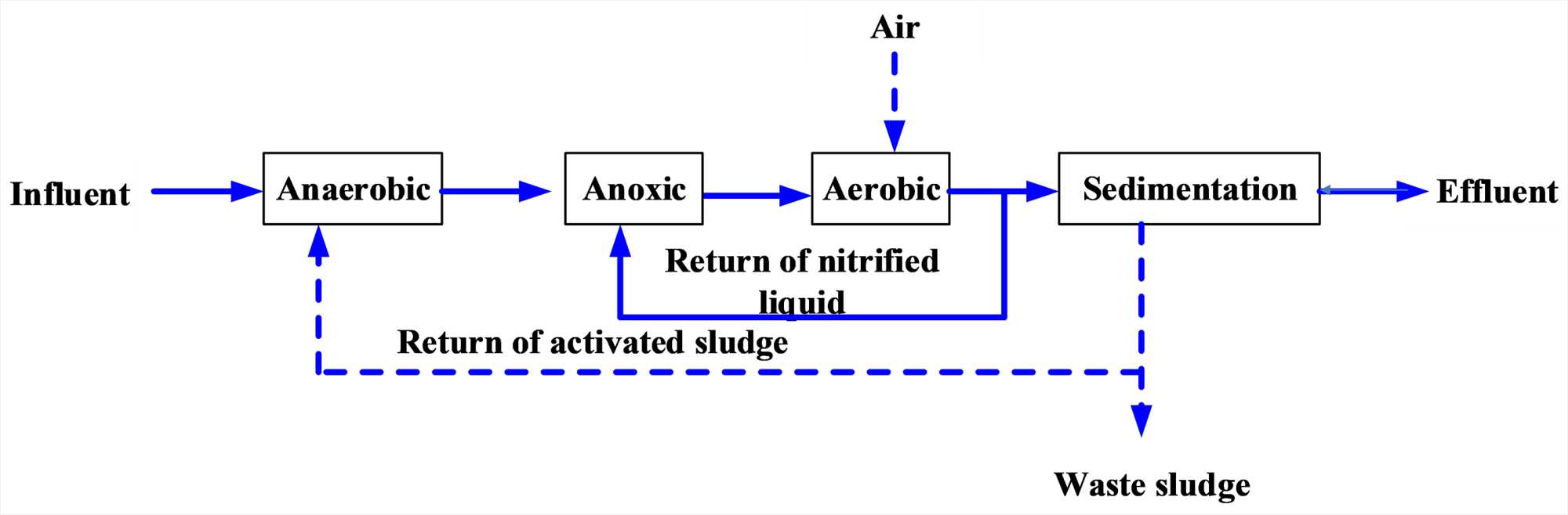 As shown in Figure 1, the sewage influent flowed through the anaerobic tank, anoxic tank, and aerobic tank in sequence, and undergoes biochemical reactions with activated sludge to remove COD, nitrogen and phosphorus pollutants.