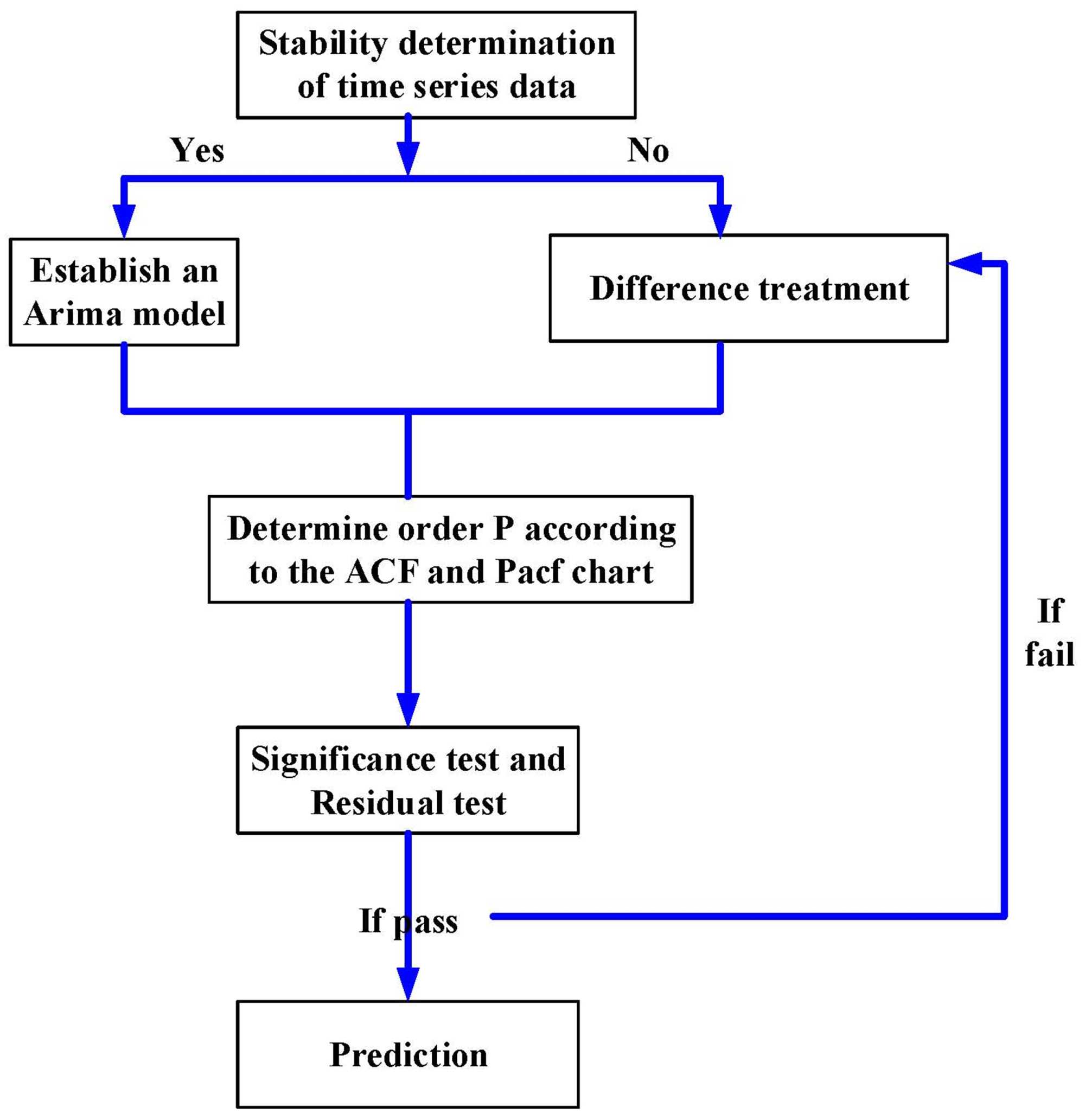 The ARIMA (p, d, q) model, also known as the Auto Regressive Integrated Moving Average Model, was a time series prediction method proposed by Box and Jenkins in the early 1970s. It can be used to predict the characteristics of random processes over time rather than being fixed, and the reason for the instability of time series was random rather than deterministic. The ARIMA model refereed to a model established by regressing only the lagged value of the dependent variable and the present value and lagged value of the random error term during the process of converting non-stationary time series into stationary time series.