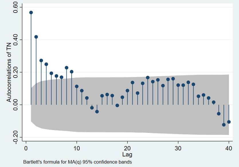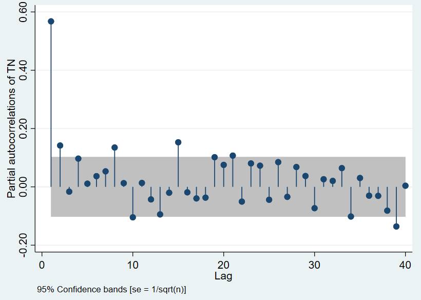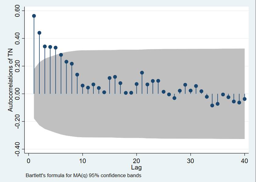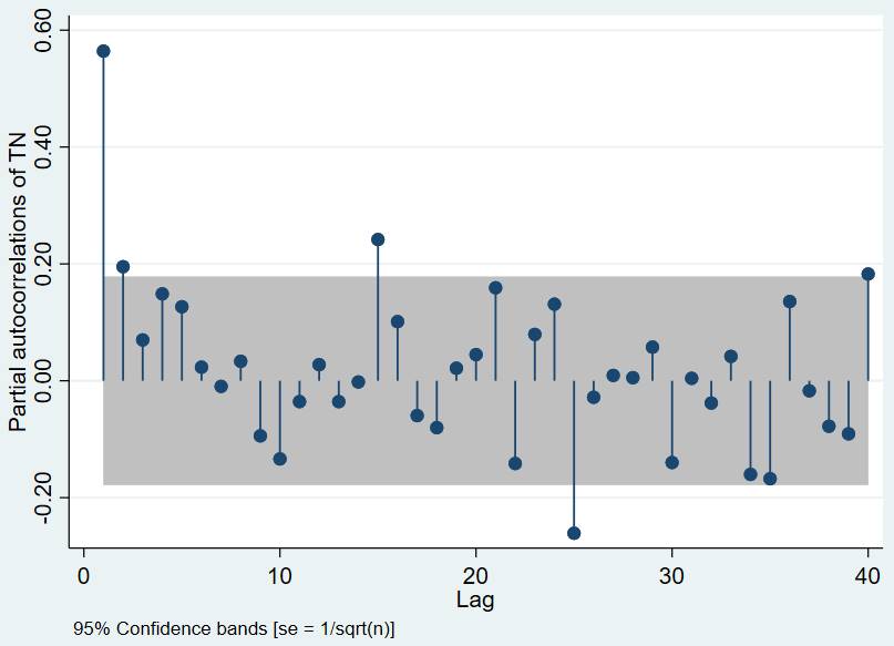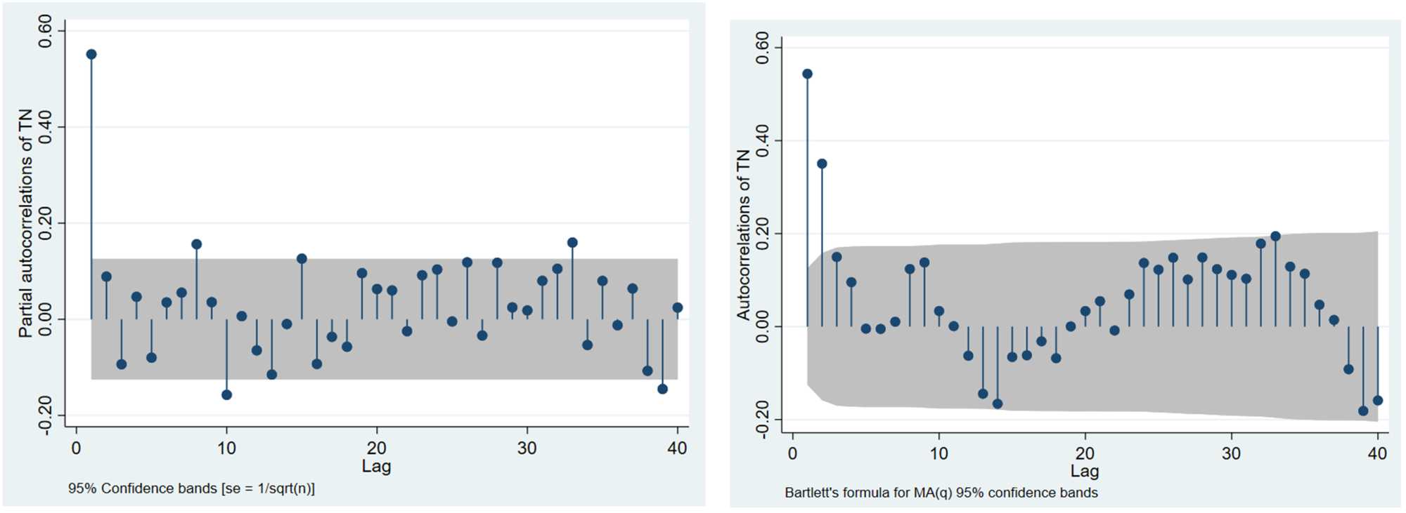 Using the Stata software command fuller, ADF unit root tests were performed on the time series of total nitrogen and BOD, and the results were shown in Table 5. It was evident that the p-values for both total nitrogen and BOD were below 0.05, indicating that these variables are stationary sequences and, therefore, do not require differentiation. Therefore, d = 0 was determined. Table 5 showed ADF test statistic.