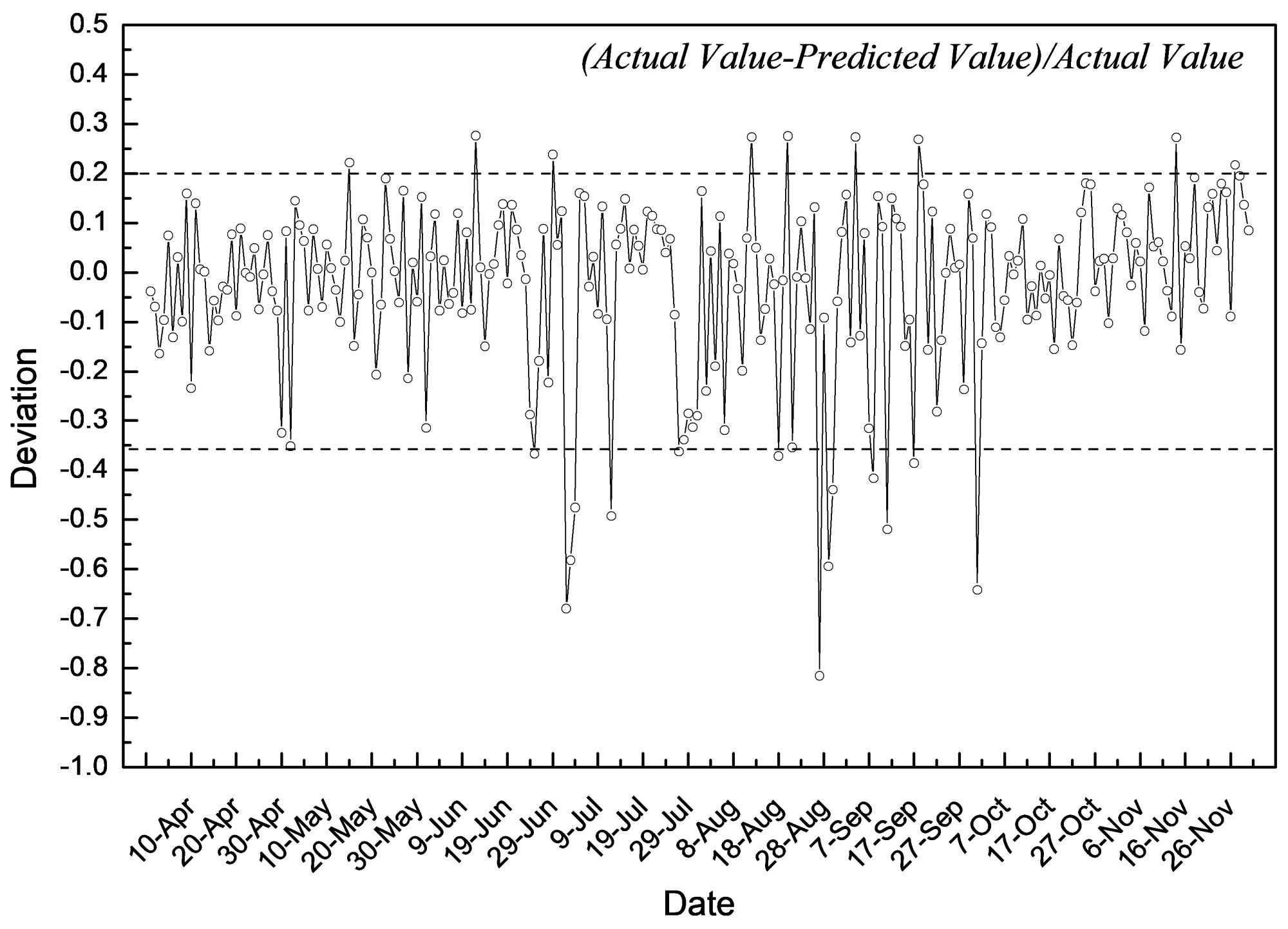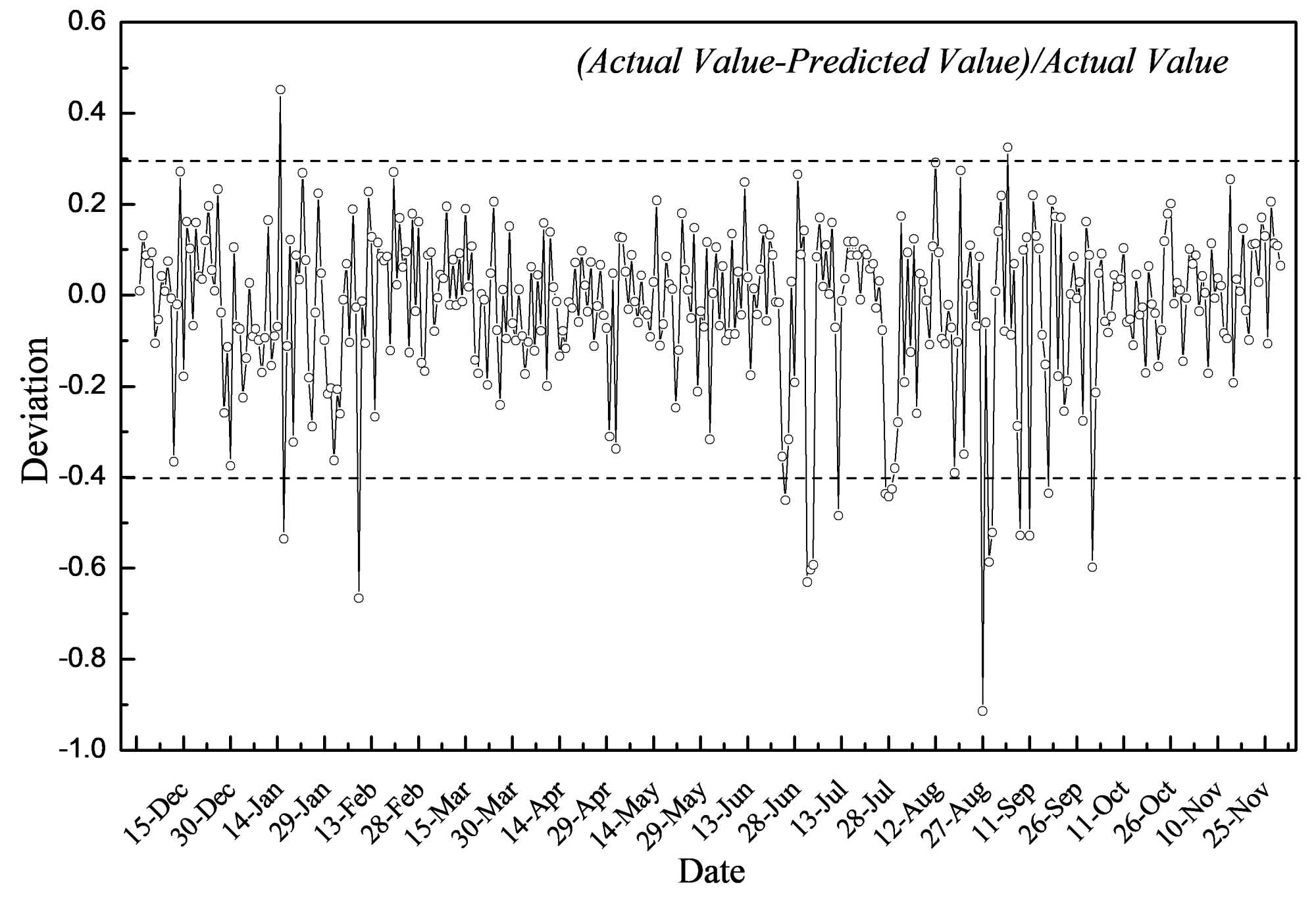 Subtracted the predicted value from the actual value to obtain the difference, and compared the difference with the actual value to obtain the deviation rate, as shown in Figure 5. From Figure 5, it can be seen that the deviation rate was mainly concentrated in (−40%, 30%). The results showed a few large prediction deviation without considering the seasonal change. Therefore, in order to decrease the prediction deviation, the seasonal change was considered at various months because of temperature change.