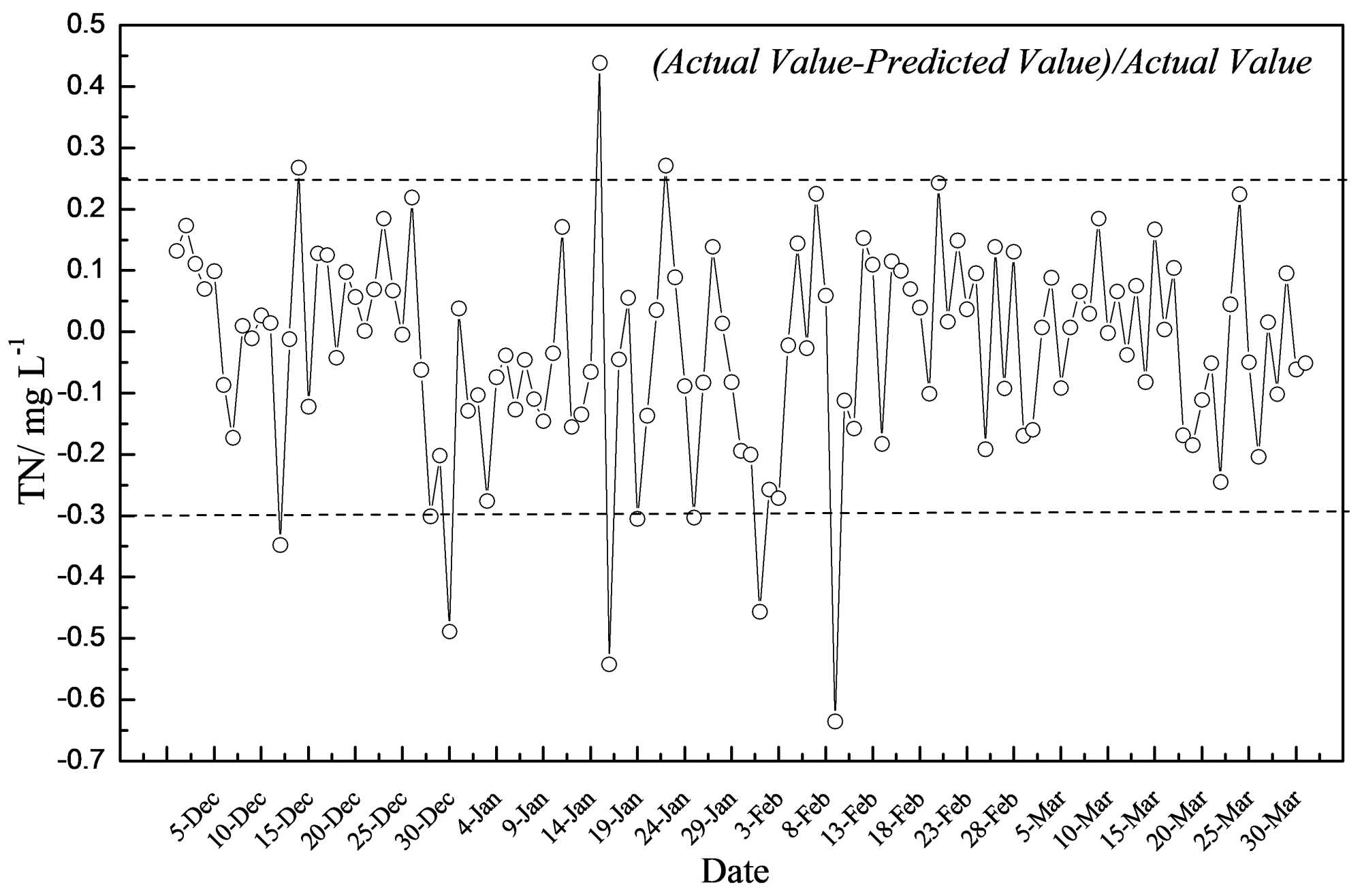 From Figure 8, it can be seen that the deviation rate was mainly concentrated in (−30%, 20%), and only 12 of the predicted points were far off from the above range. The sample points with large deviation value accounted for 9.92 % of total sample. Especially, Most of the deviation values were negative, which can be beneficial for ensuring that the effluent meets the discharge standard.