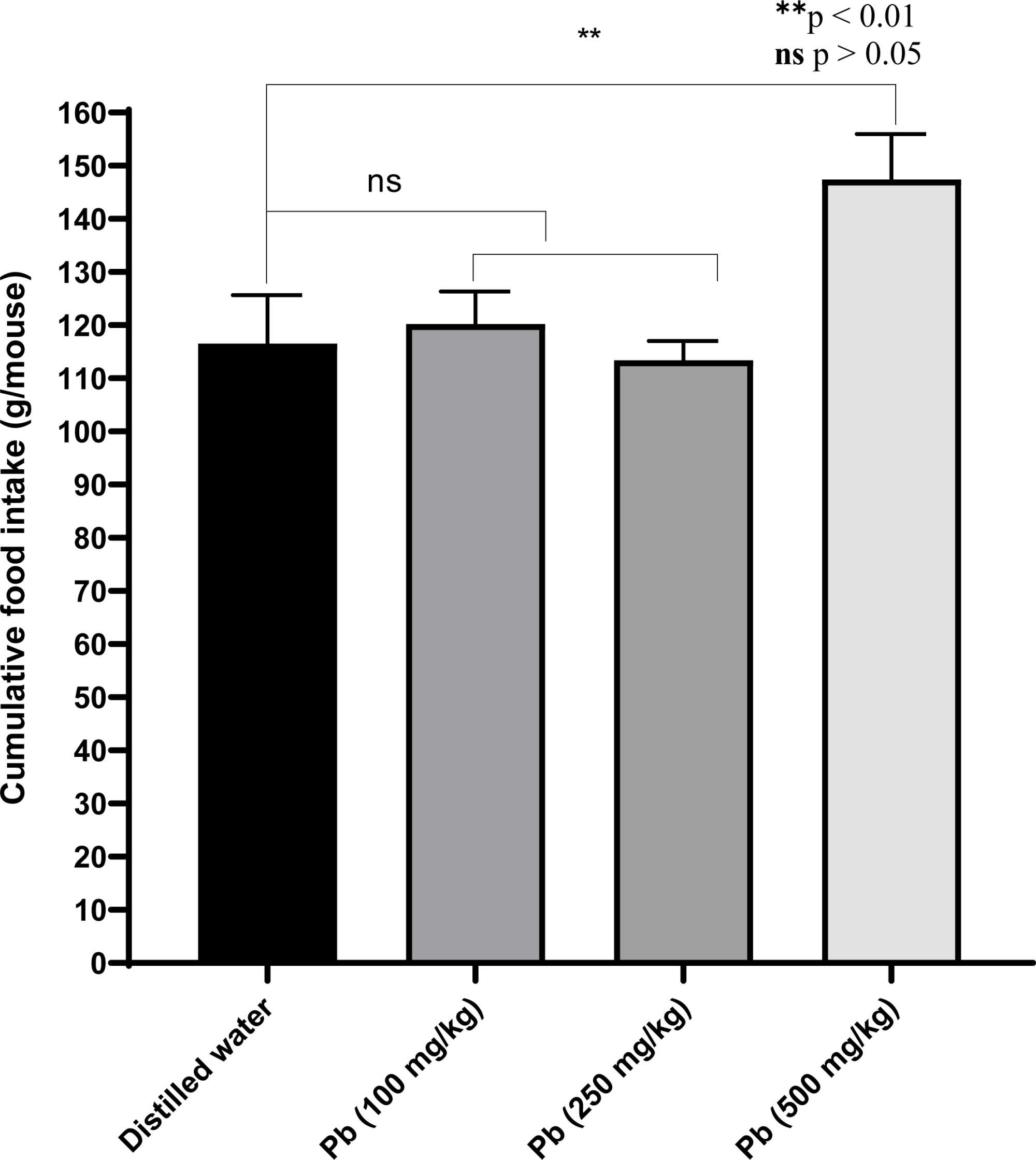 In the long term, the inhibition of food intake remained constant for 13 days with the 3 doses of Pb. The 100 mg/kg Pb dose significantly inhibited food intake for up to 31 days (p = 0.0174) (Figure 4). Cumulative food intakes did not show a significant difference with Pb 100 mg/kg and Pb 250 mg/kg compared to the control group, but it was significant (p = 0.0043) with Pb 500 mg/kg (Figure 5).