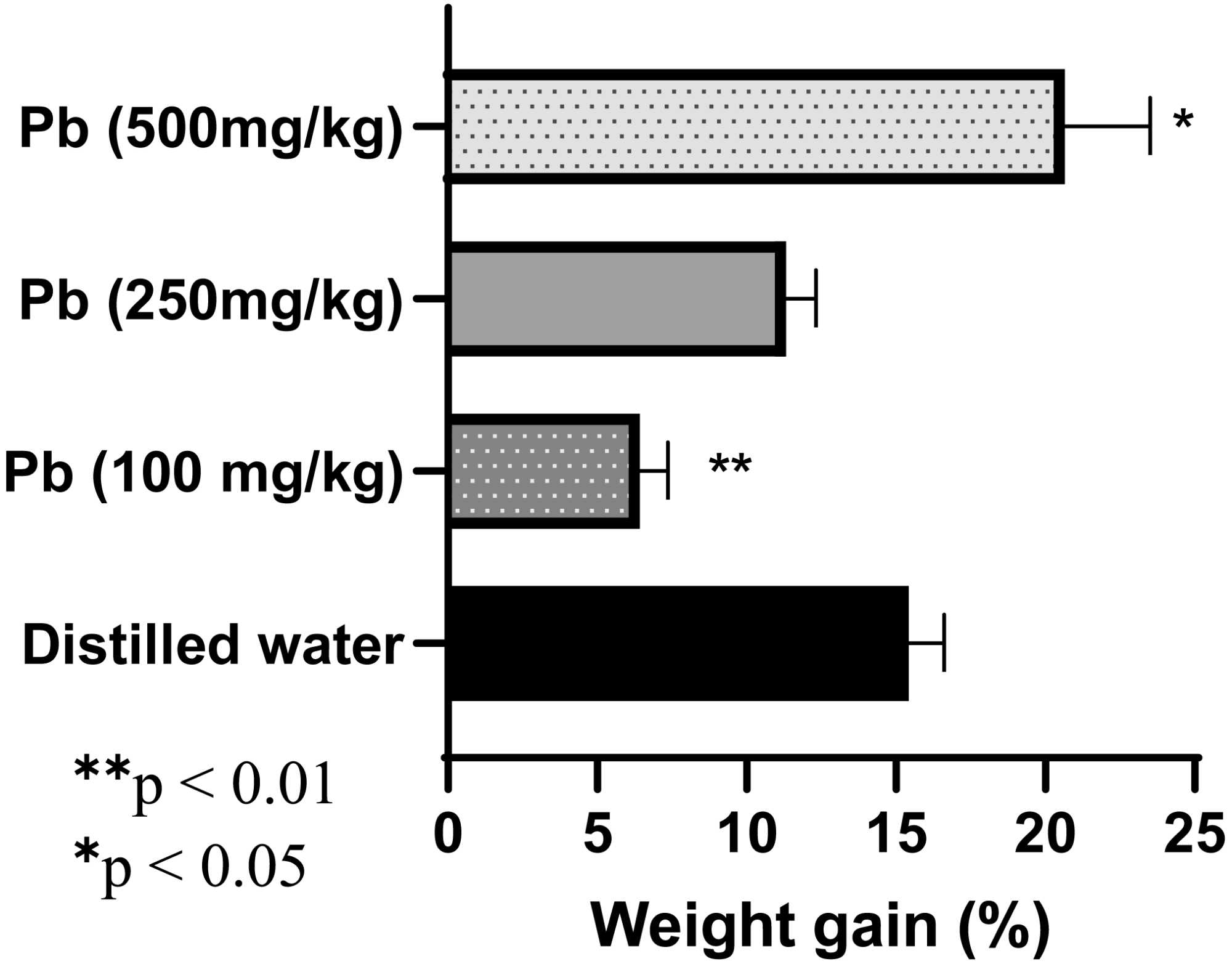 The dose of Pb 100 mg/kg significantly reduced (p = 0.0003) weight gain compared