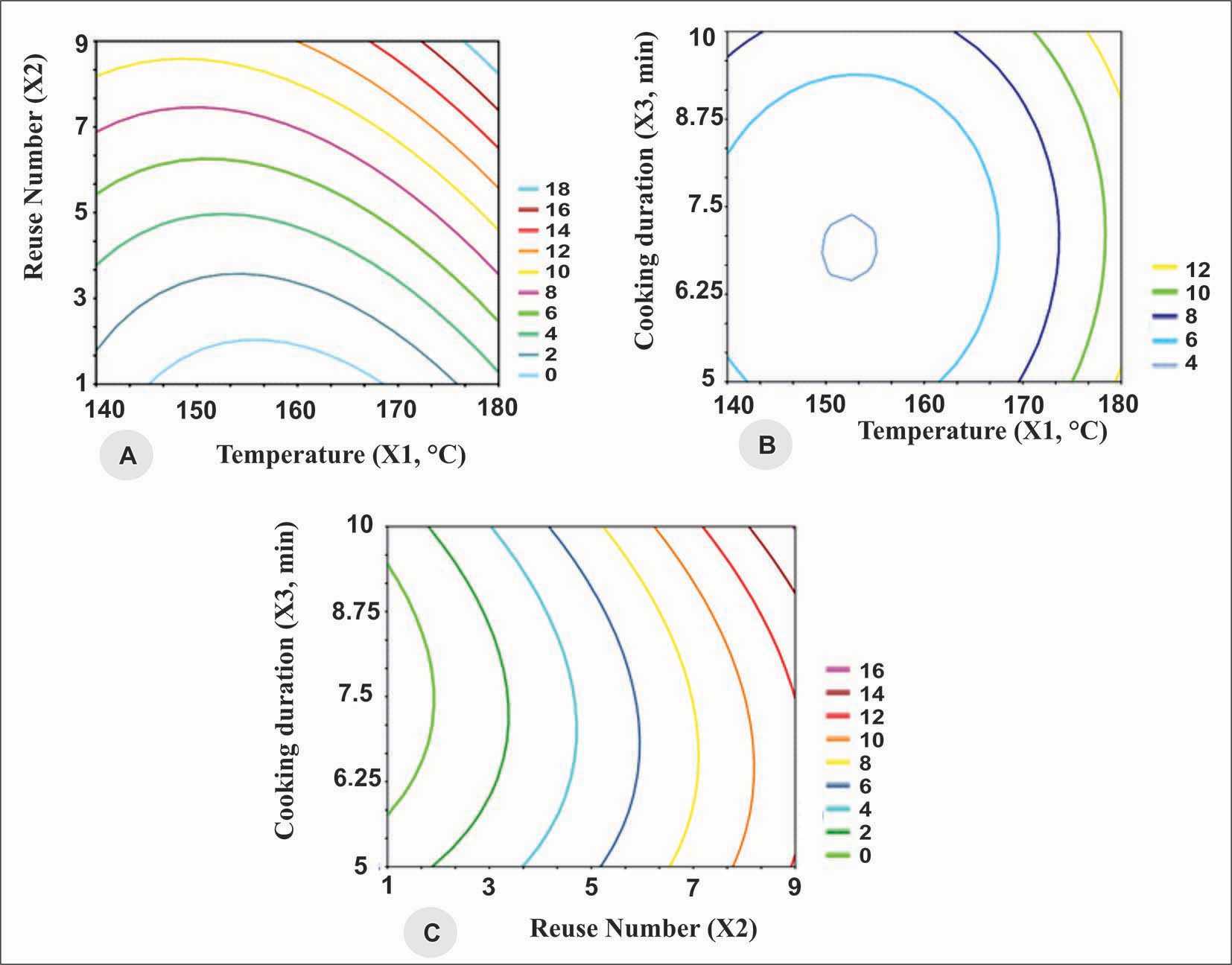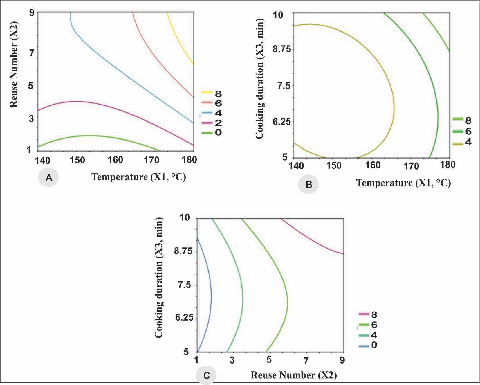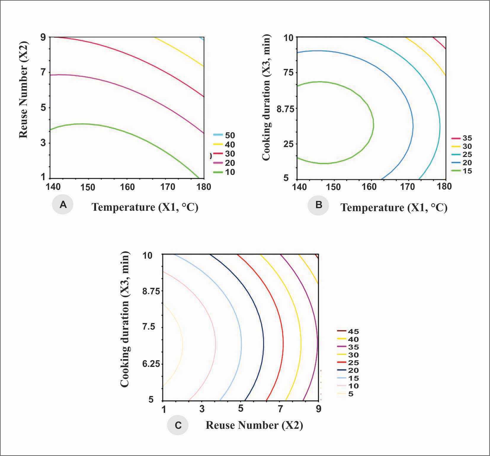Figure 3. Isoresponse profile of acid value change of the combined effects: (A) Temperature and number of re-uses, (B) Temperature and frying time, (C) Number of re-uses and frying time.