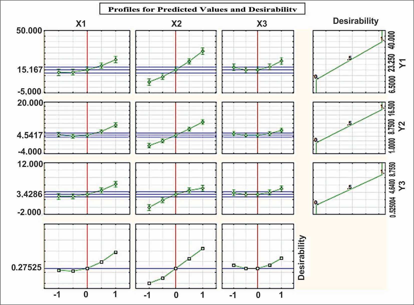 The values of the response optimizing factors (Y1: neo-formed compounds, Y2: peroxide number, Y3: acid number) at the limit of the recommended values required for a consumable frying oil were determined using the desirability function of the STATISTICA 10 software (Figure 4).