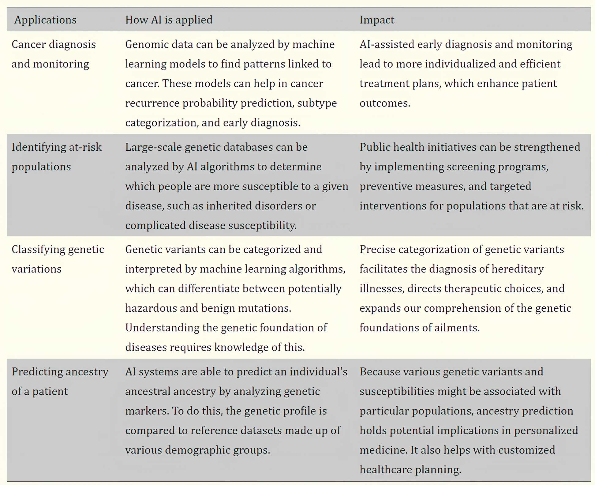 Genomic data analysis involves examining the entirety of an individual’s genetic information (genome) to identify mutations, variations, and patterns that may be linked to diseases or traits. AI is particularly useful in analyzing large-scale genomic data because of its ability to sift through massive amounts of data within a short period of time. ML and DL-based AI algorithms are highly efficient in identifying mutations associated with genetic disorders. For instance, AI systems can scan entire genomes to detect single nucleotide polymorphisms (SNPs), copy number variations (CNVs), and other mutations that may contribute to diseases like cystic fibrosis, Huntington’s disease, and various cancers. As patient records become electronic and accessible through a computer, it becomes easier and more convenient to employ such AI technologies within the real-world setting [24].