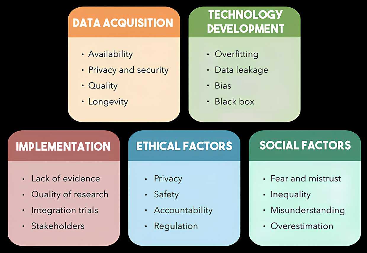 Figure 2 provides an overview of a few hurdles that we must overcome before completely integrating AI into healthcare.