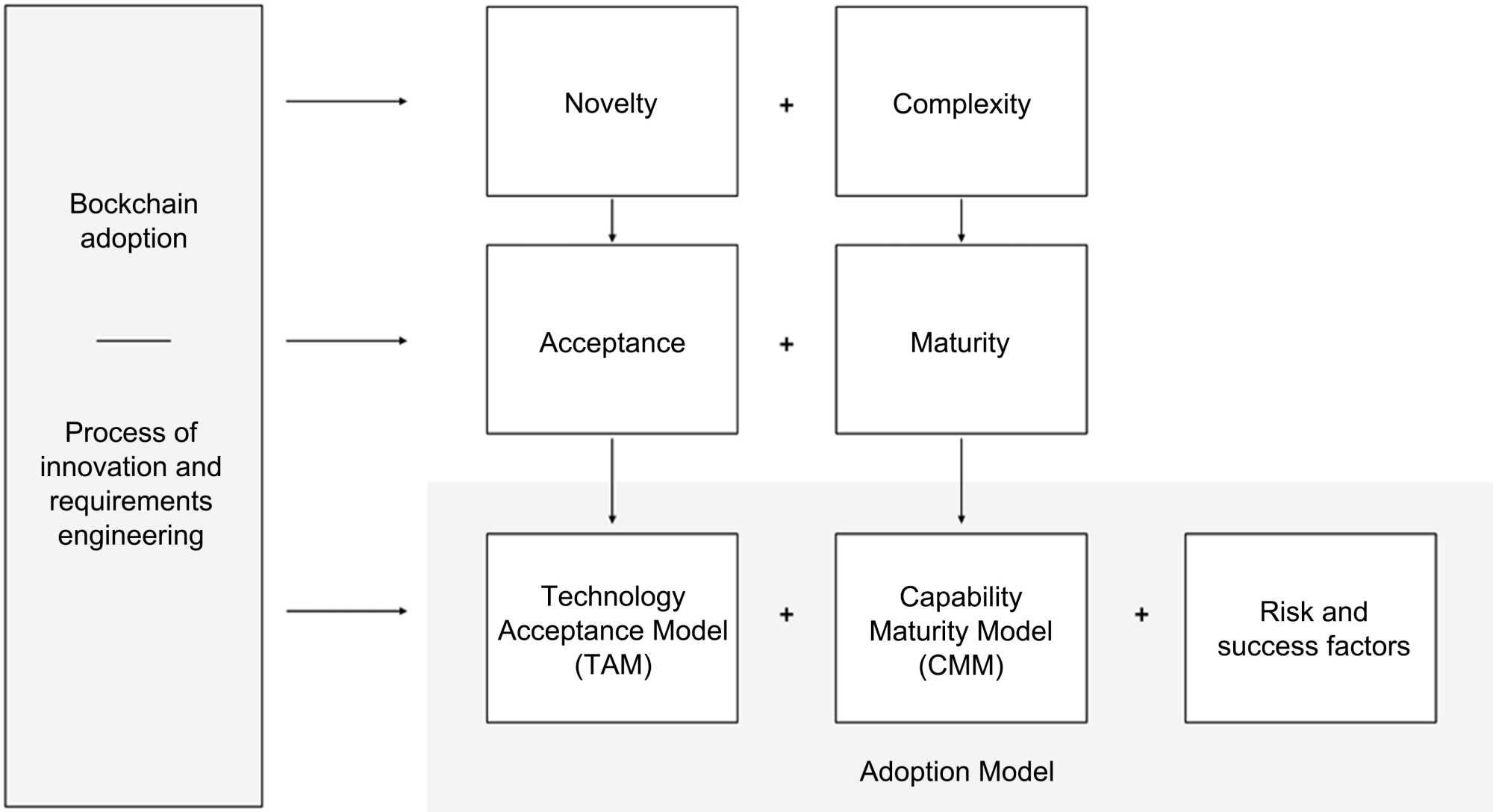 This study delves into the current literature on technology adoption management and proposes a new model, TAM + CMM, to handle requirements engineering and the elements that contribute to the success or failure of blockchain-driven business innovation in the long run. Here is the outline of the article: In Section 2, we lay out the methodology, tools, and questions that will guide our investigation. The findings are related to these inquiries that were posed in Section 3. In Section 4, we go over the findings and how they relate to sustainability, risk management, and blockchain technology. In Section 5, the study comes to a close and provides a look ahead to potential research endeavors.