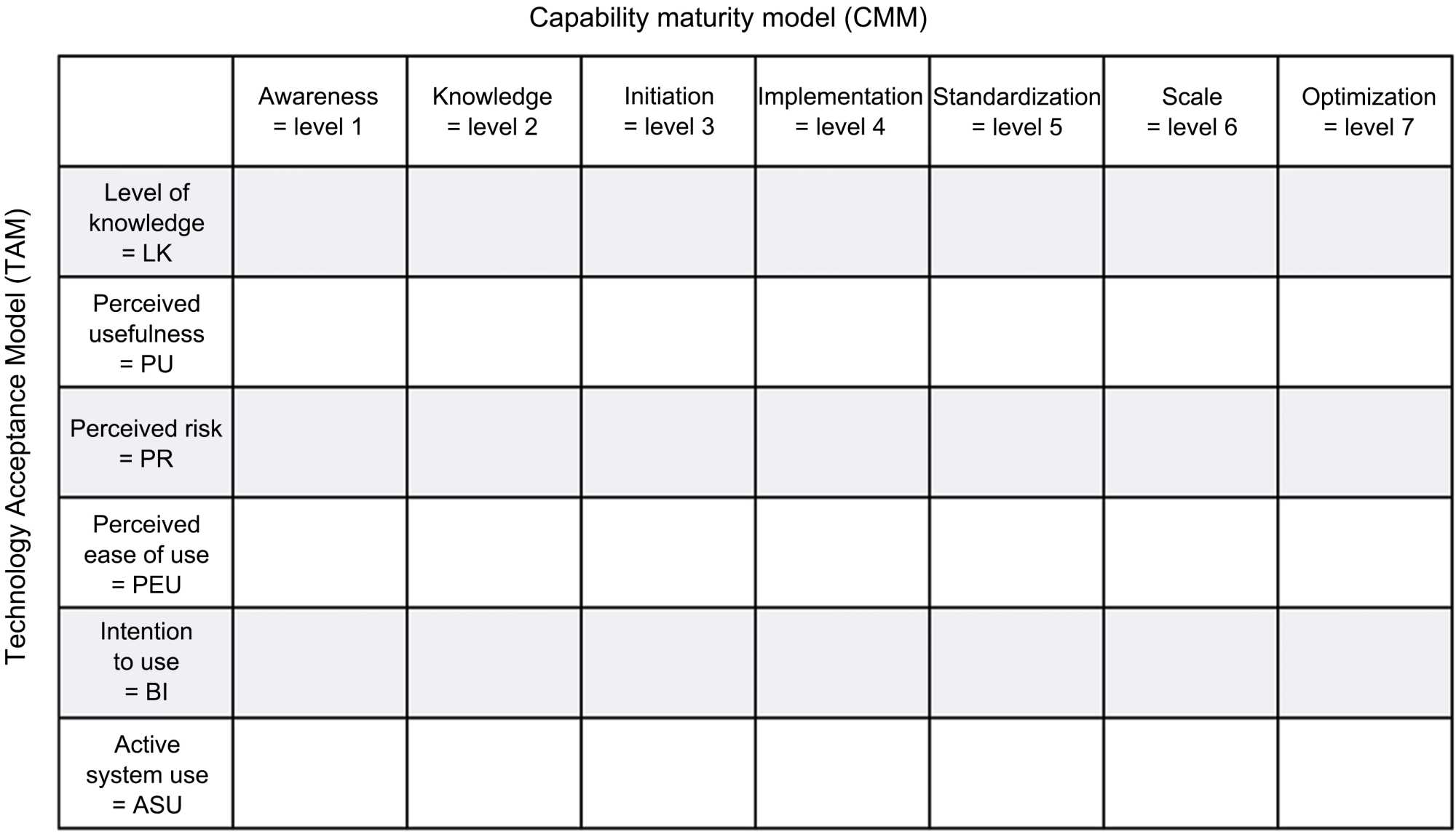 Figure 2. A tailored and integrated adoption model (TAM) and a customer relationship management system (CMM) to facilitate long-term, blockchain-powered company innovation. The X-axis represents the “Capability Maturity Model,” and the Y-axis represents the “Technology Acceptance Model” (TAM).