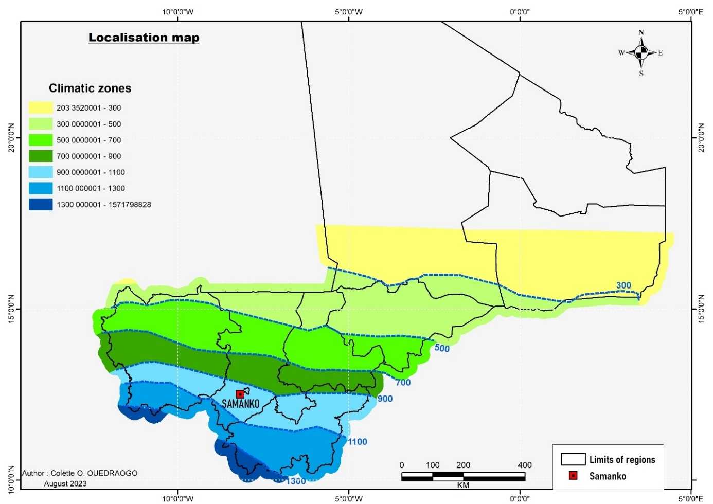 The assessment was carried out during the 2023 rainy season in Mali, specifically at the World Vegetable Center experimental station in Samanko (Figure 1). This site receives an annual rainfall of 1047 mm and features nutrient-rich clay soil with high water retention capacity but it can be difficult to work with, especially when dry. The average temperature at the site is 27.7˚C. Figure 1 illustrates the location of the experimental site and the general distribution of rainfall in this area