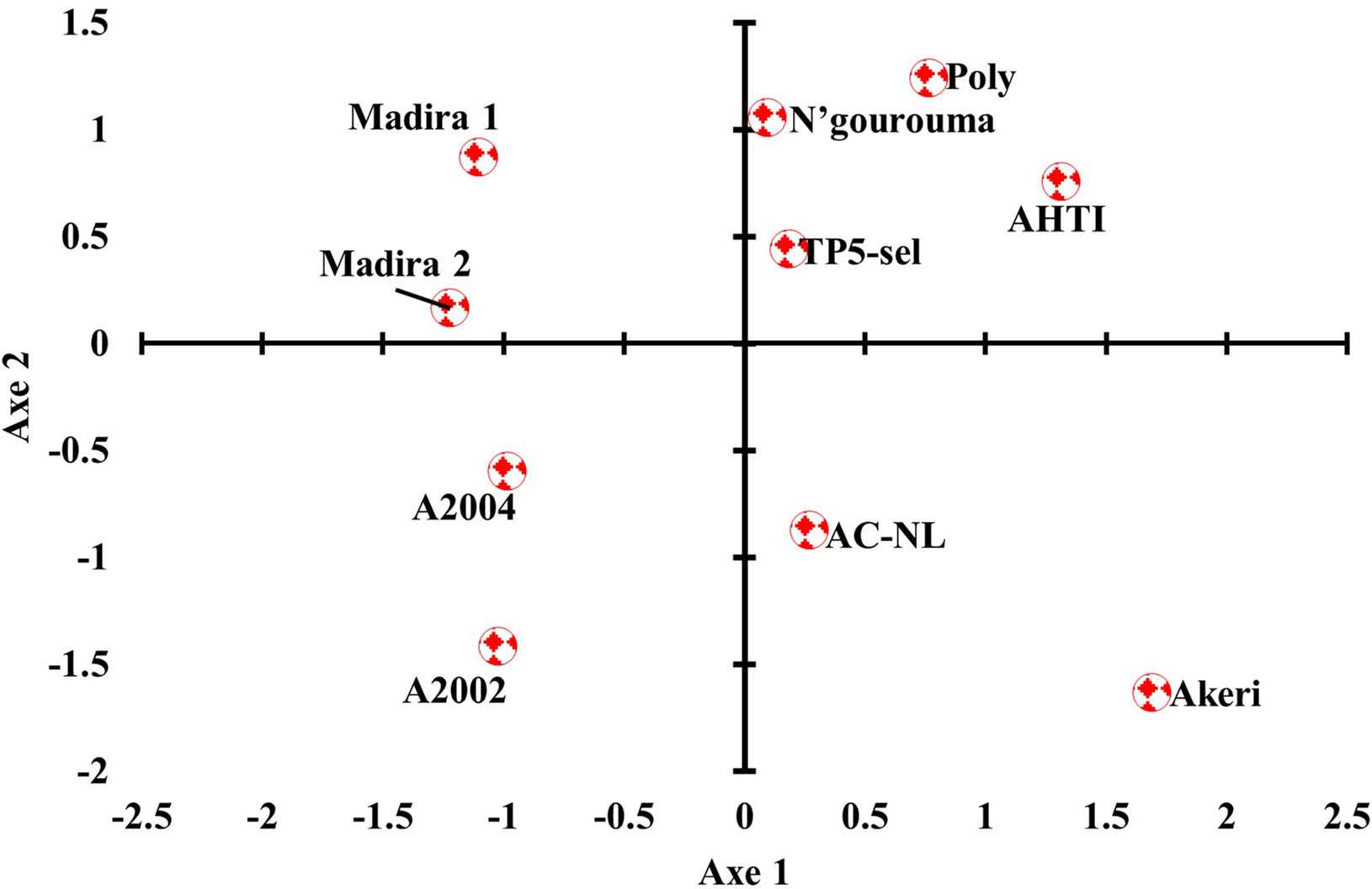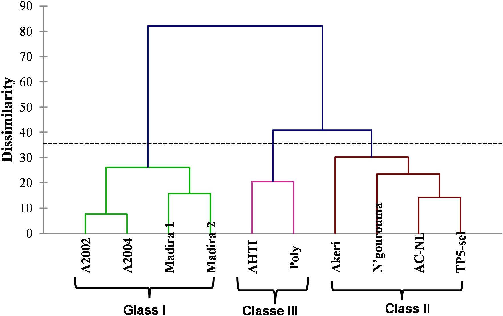 Additionally, ten varieties were used as supplementary variables: “Madira 1” “Madira 2.” “A2004” “A2002”, “N’gourouma”, “Akeri”, “AC-NL”, “Poly” and “AHTI”. An ascending hierarchical classification (CAH) was applied to construct groups of varieties according to agro-morphological characteristics and yield components using XLSTAT 2014.5.03 software.