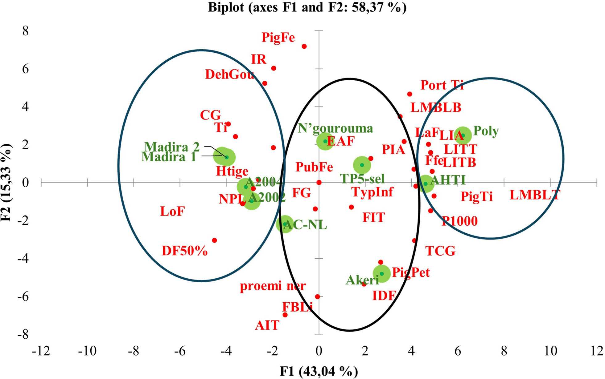 Accessions “Akeri”, “TP5-sel”, “AC-NL” and “N’gourouma” are closely associated with several variables: the weight of 1000 grains (P1000), stem pigmentation (PigTi). petiole pigmentation, average length of the terminal branches (LITBT), and the and the shape of the leaf (Ffe).
