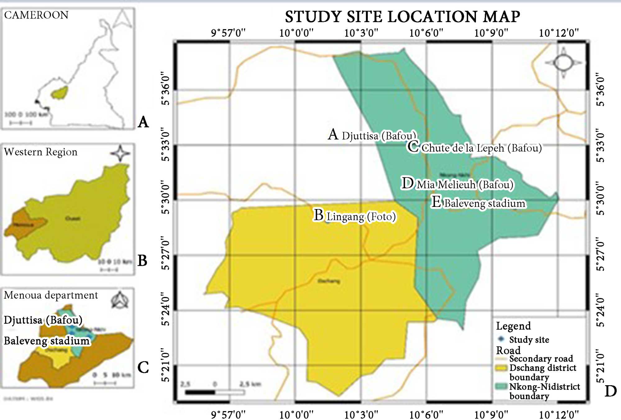 The Cameroonian Highlands forests are a montane tropical forest ecoregion located on the range of mountains that runs inland from the Gulf of Guinea and forms the border between Cameroon and Nigeria [1]. The Western Highlands of Cameroon is one important part of this ecoregion. The Bamboutos Mountains which constitutes the western highlands, is located between latitude 5°32’ and 5°51’ North and longitude 9˚56’ and 10˚09’ East. The peak of Mt Bamboutos constitutes the fourth highest point on the Cameroon highlands chain, with an altitude of 2740 m [2]. The landscape cuts across three regions: West, South-West and North-West regions of Cameroon, starting from Batibo in the North-West region to Alou in the South-West [3].
