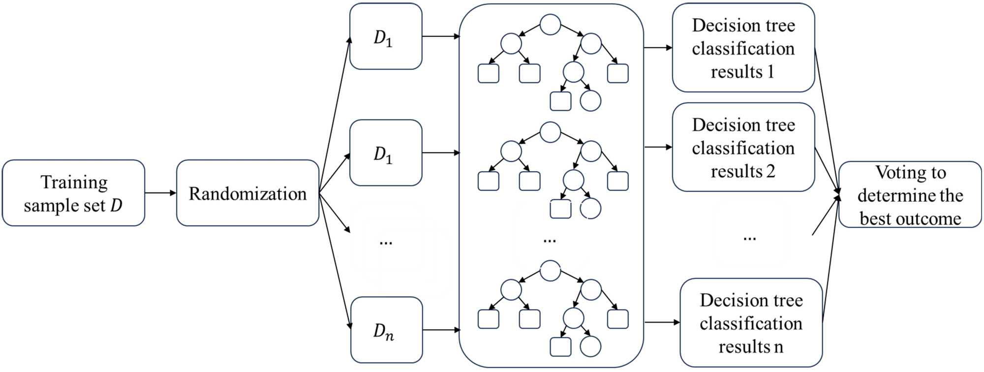 Random Forest uses the bootstrap self-service resampling technique to randomly extract n samples from the training set of the original data with replacement to form a new training set. For each sample set, a decision tree is built based on the characteristics and the best split point is determined. This process is repeated many times to generate m decision trees. Finally, the test set is predicted using the bagging strategy and a majority voting mechanism. The learning process of the random forest algorithm is shown in Figure 4 below: