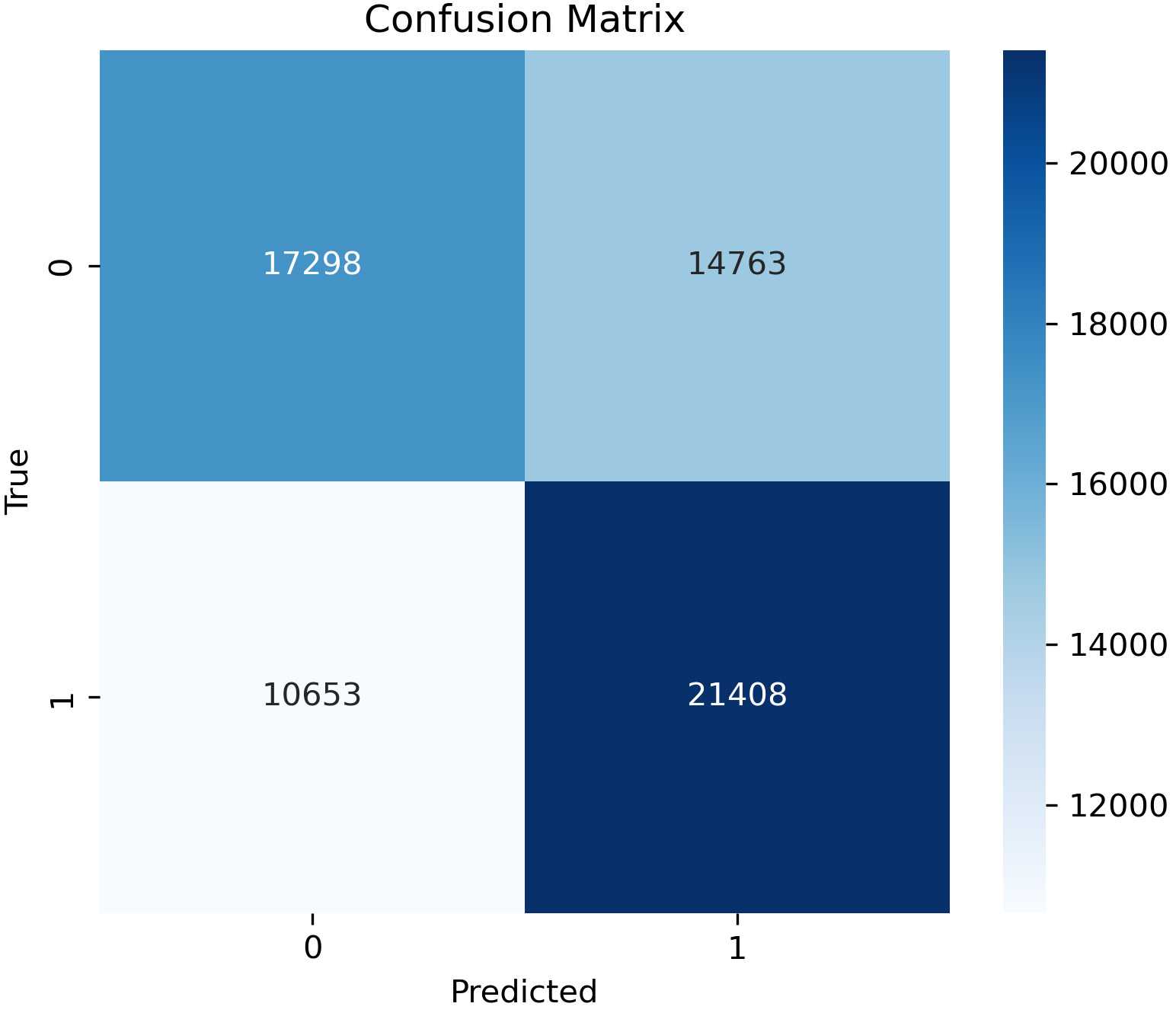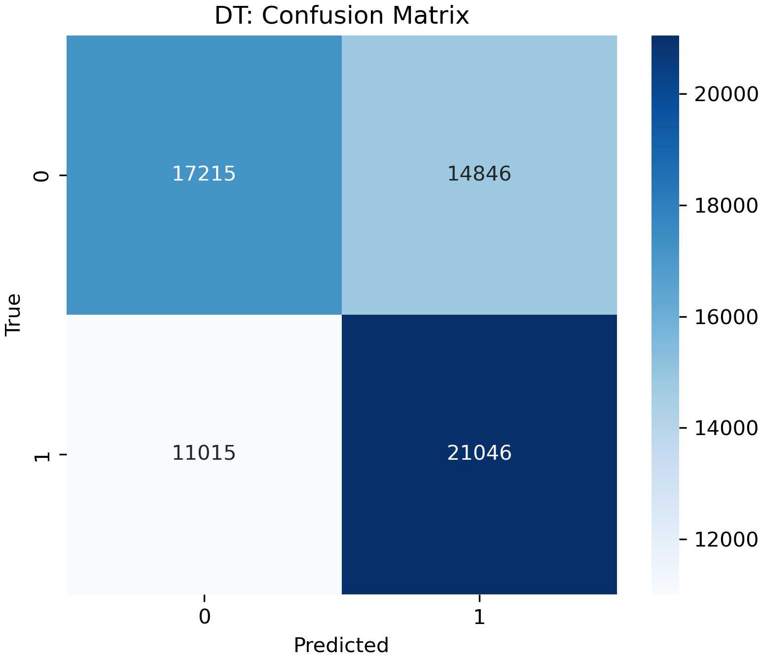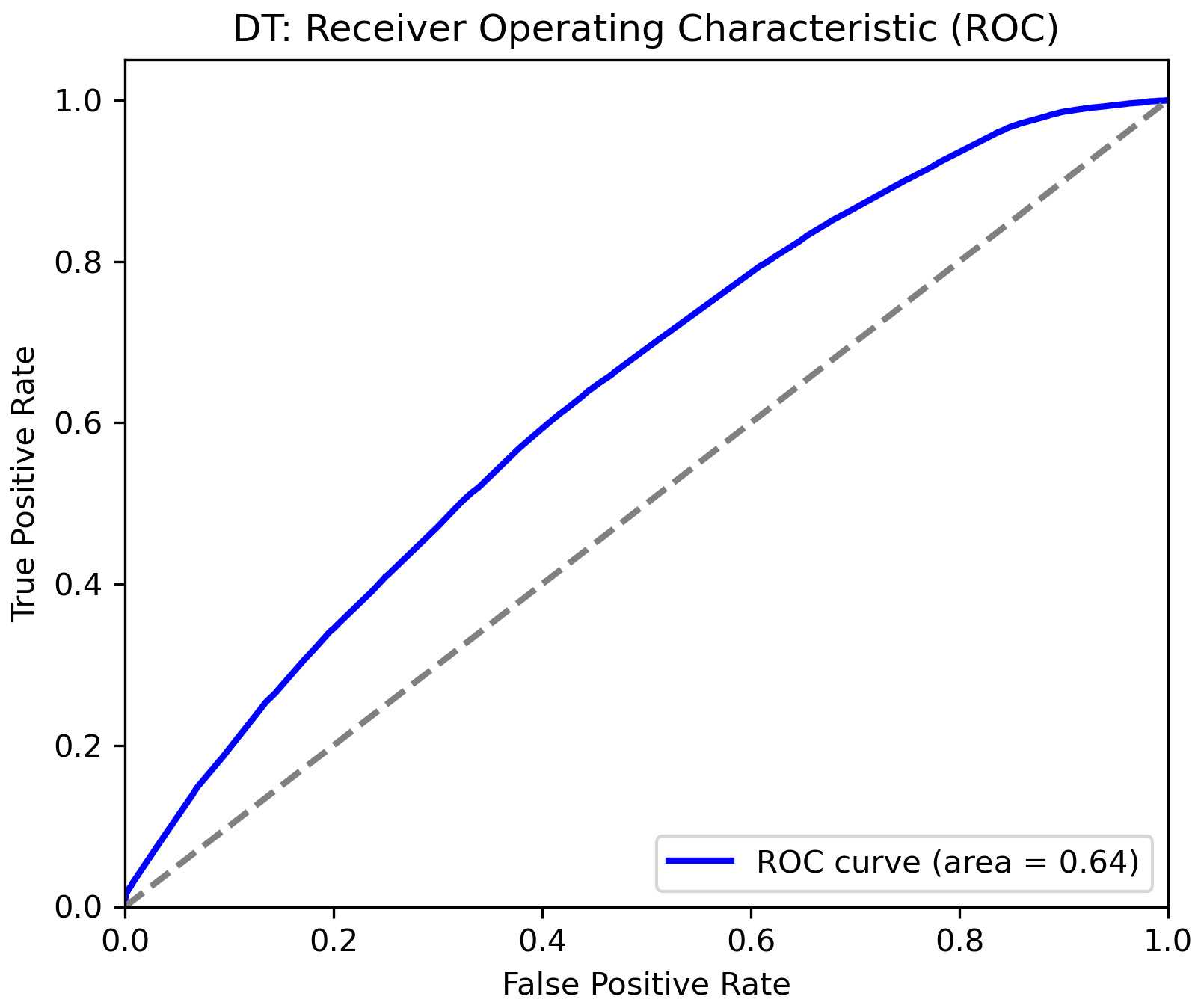In summary, Random Forest performed the best overall, achieving a mean accuracy of 0.6025, F1 score of 0.6262, and AUC of 0.6467. Random Forest’s robust performance across all metrics suggests it is the most reliable choice for this problem, demonstrating strong predictive power and stability without overfitting. XGBoost, while having a lower accuracy (0.5184), excelled in F1 score (0.6743) and AUC (0.6582), showing its ability to effectively balance precision and recall, especially in class-imbalanced scenarios. Decision Tree showed comparable results to Logistic Regression, with a slight improvement in accuracy (0.5956) and AUC (0.6376), indicating that it could be useful in cases where model interpretability is critical. Logistic Regression performed reasonably well but had relatively lower AUC and F1 scores compared to the more complex models, with a mean accuracy of 0.5794, suggesting that while it is suitable for simpler tasks, it may not be the best choice for imbalanced datasets or non-linear relationships.