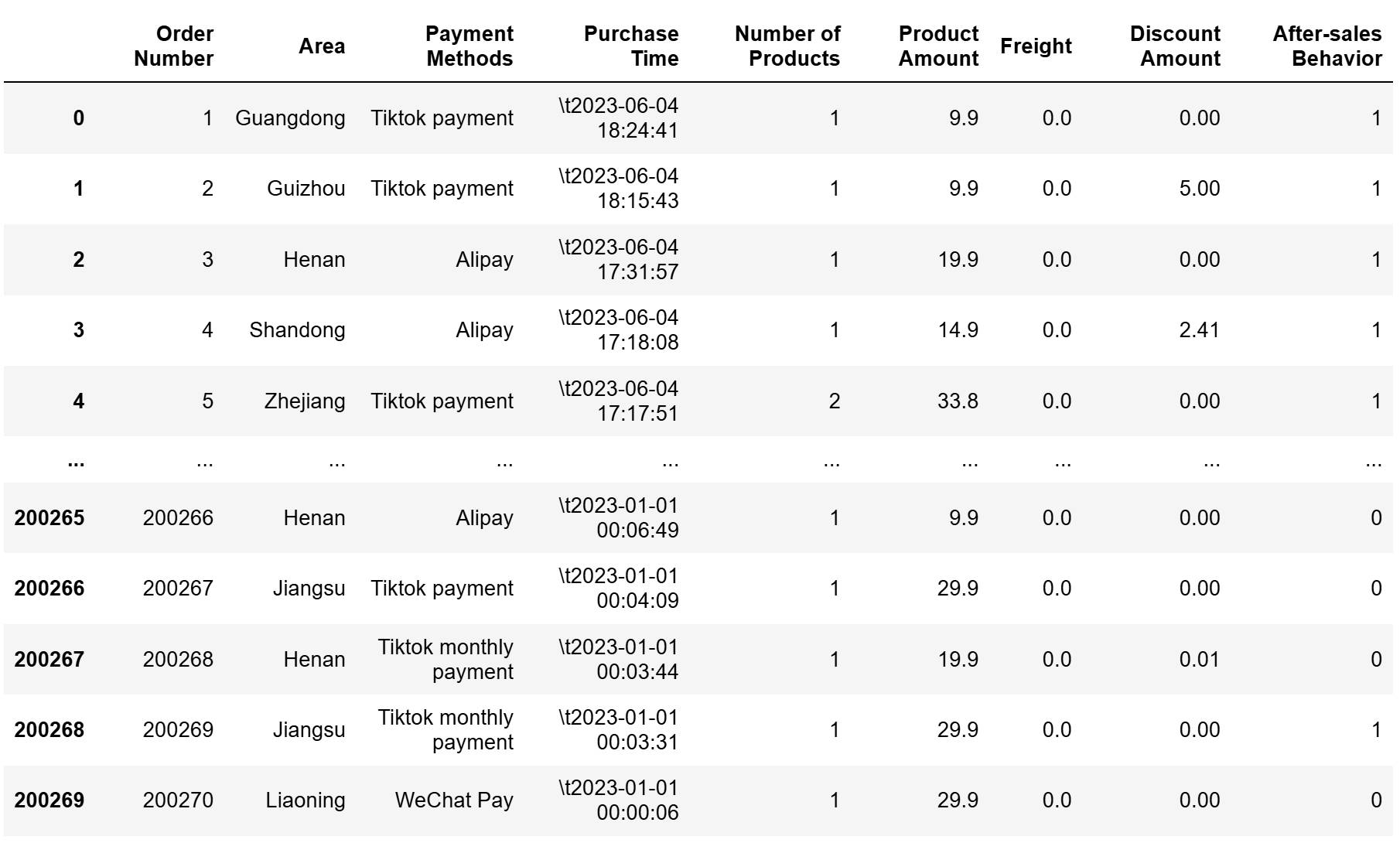 The data contains a total of 200,270 order data from the store from January 1, 2023 to June 6, 2023, of which some order information is shown in Figure 1: