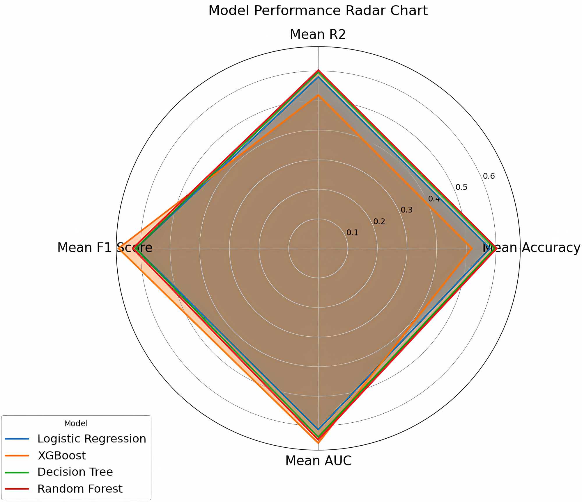 To provide a comprehensive overview of the models’ performance, we have included a radar chart (Figure 8) that visualizes the mean accuracy, mean R2, mean F1 score, and mean AUC for each model. This chart offers a clear and concise comparison of the models’ performance across different metrics.