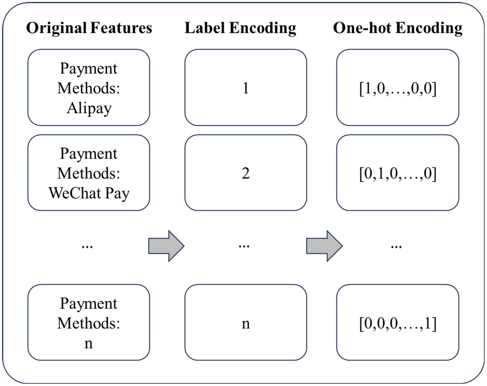 One-Hot Encoding is a common method for converting categorical variables into numerical data, especially in machine learning models [11]. The core idea is to represent the value of each category as a binary vector with a length equal to the total number of categories, where only one position is 1 and all other positions are 0. Each category corresponds to a unique position. Here, we apply one-hot encoding to the payment method. (Figure 2)