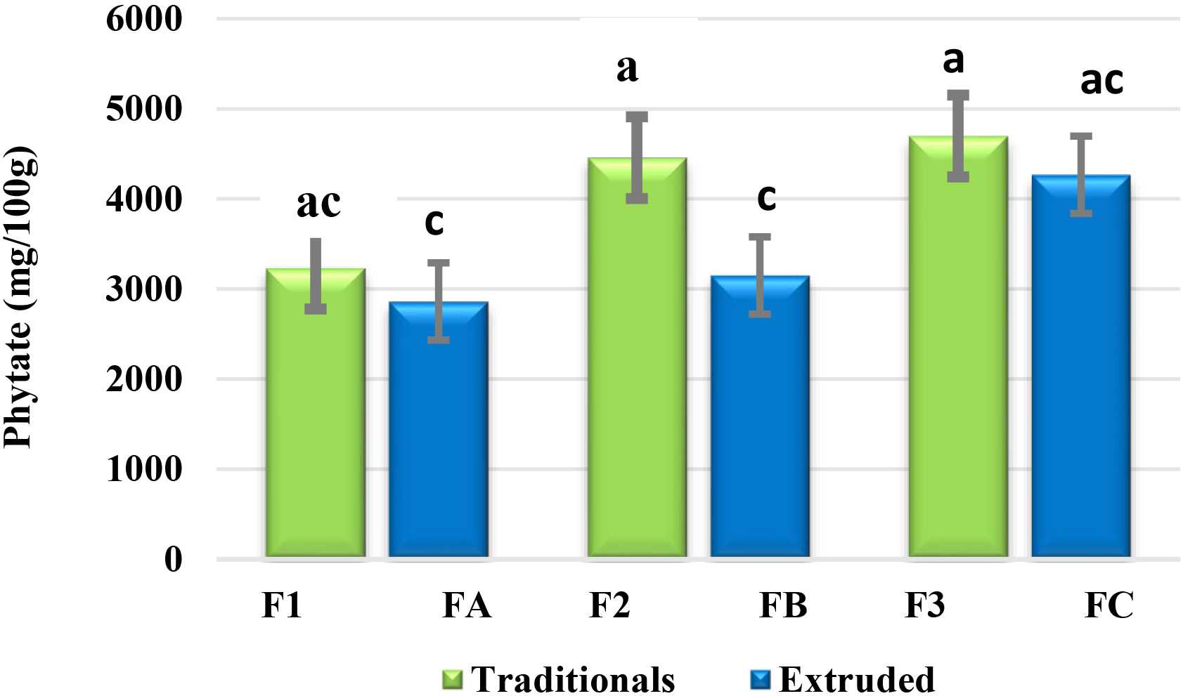 The effect of extrusion cooking on phytate reduction, in comparing co-extruded flours FA, FB and FC with their non-extruded controls, was studied. The results, in Figure 1, showed that extrusion processing significantly reduced phytate levels by 11.46%, 29.34%, and 9.16% respectively in FA, FB, and FC. In comparison before extrusion, phytate contents were at 3231.9 mg/100 g for F1, 4457.7 mg/100 g for F2 and 4698.2 mg/100 g for F3. After extrusion cooking process, the actual levels were 2861.5 mg/100 g, 3149.7 mg/100 g and 4267.8 mg/100 g respectively for FA, FB and FC flours. Other authors such as [24] and [25] also observed a slight reduction of phytic acid content after application of extrusion cooking. The results obtained from phytate contents in our study were higher than those reported by [4] in their mixture of millet/Baobab, millet/Moringa and millet/Baobab/Moringa.